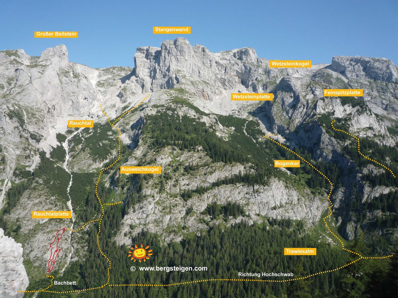 Vom Bodenbauer in Richtung Trawiesalm. Nach dem mächtigen Lawinenschlag im unteren Rauchtal auf der orogr. li. Seite des ausgetrockneten Bachbettes ca. 30m hoch. Dem Bachbett dann etwas 50m folgen bis nach links ein Steig zum Einstieg am Fuß der Wasserrillenplatte führt.