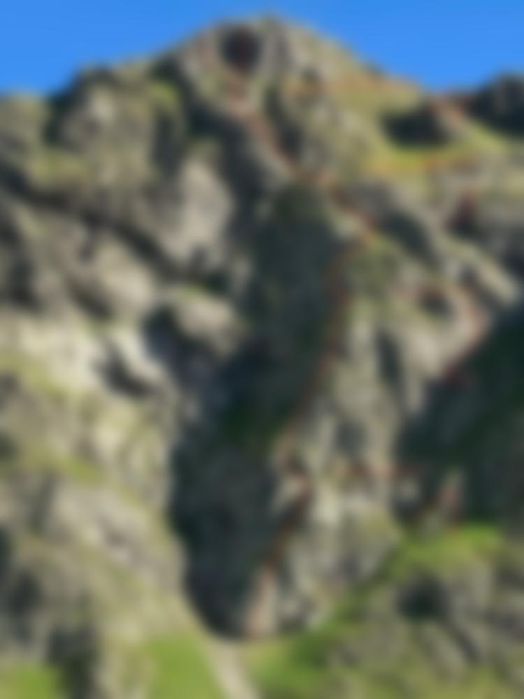 Den zentralen Pfeiler bis ans Ende, von hier linkshaltend durch eine ausgeprägte Rinne, gerade zum Gipfel.
