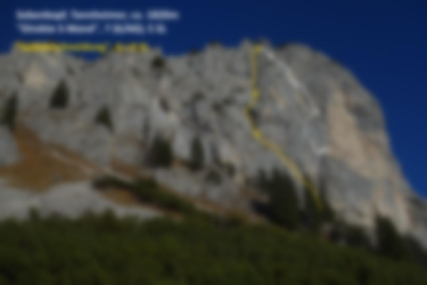 Da ein großes Routenwirrwarr in der Wand herrscht und an manchen Ständen bis zu vier Routen zusammenkommen, ist die Orientierung nicht immer ganz einfach. Die "Südverschneidung" lässt sich im Anschluss gut in zwei 60-Meter Seillängen klettern, links gibt es noch die Bohrhakenroute Ultima Ratio (6+). Das Topo bzw. Wandbild mitnehmen!
