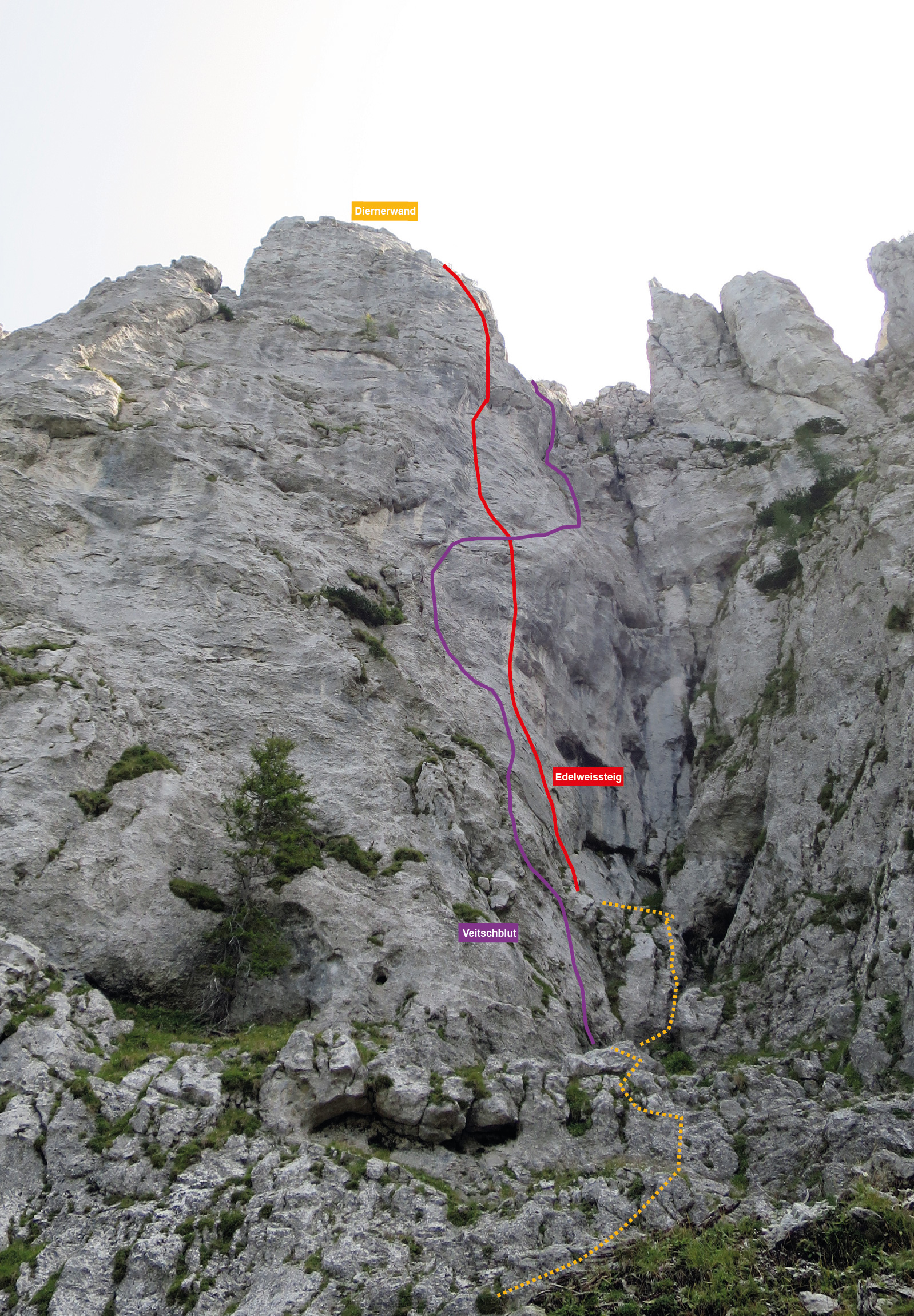Extrem schwierige und anspruchsvolle Tour in der Diernerwand. Perfekter steiler Lochfells und weite BH-Abstände