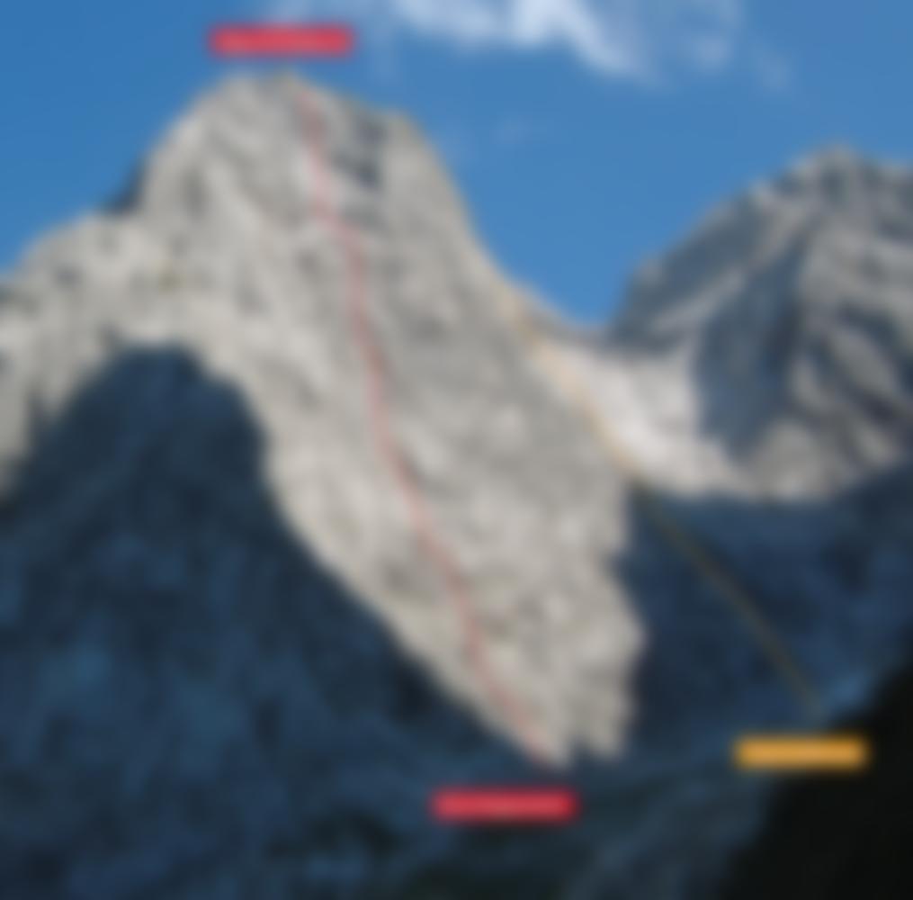 Vom BH auf einem flachen Schotterplatz noch ca. 150 m am Grat (1- 2, auch einzelne BH) zum unscheinbaren Gipfel. Von hier auf Steigspuren in eine Steilrinne (Stellen bis 1) hinab, vorbei an einem Felsenfenster zur 1. Abseilstelle. Nun 6 x 20 m hinab zum Einstieg.