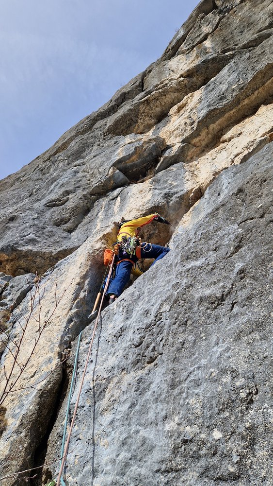 - 6e SL: 7- Zuerst etwas Grasig danach durch tollen Felsen, unter dem Dach rechts raus durch etwas brüchiges Gelände. Danach wieder links zum stand direkt über dem Dach!