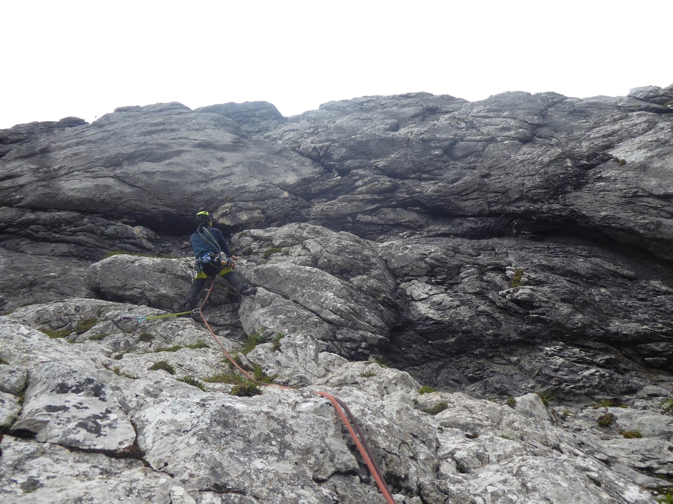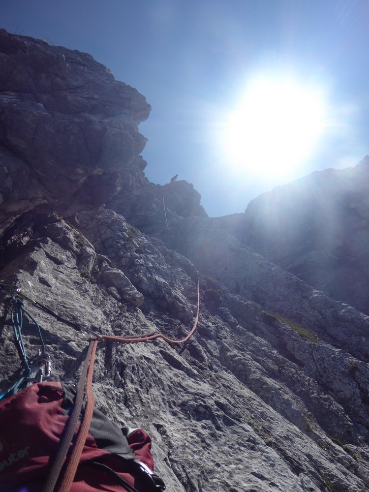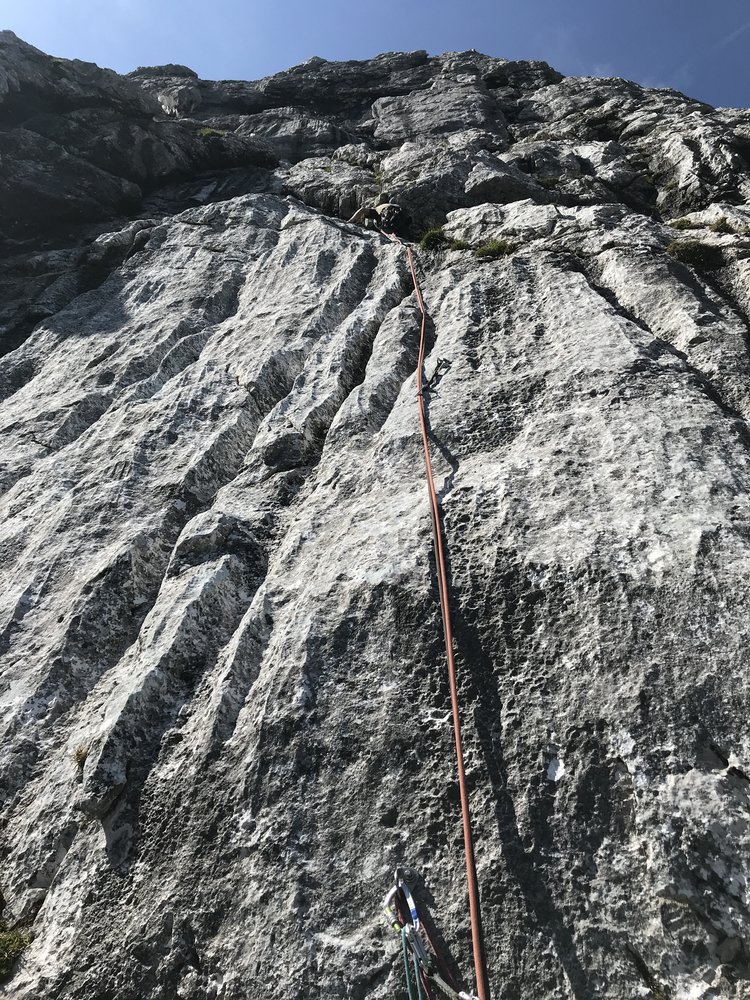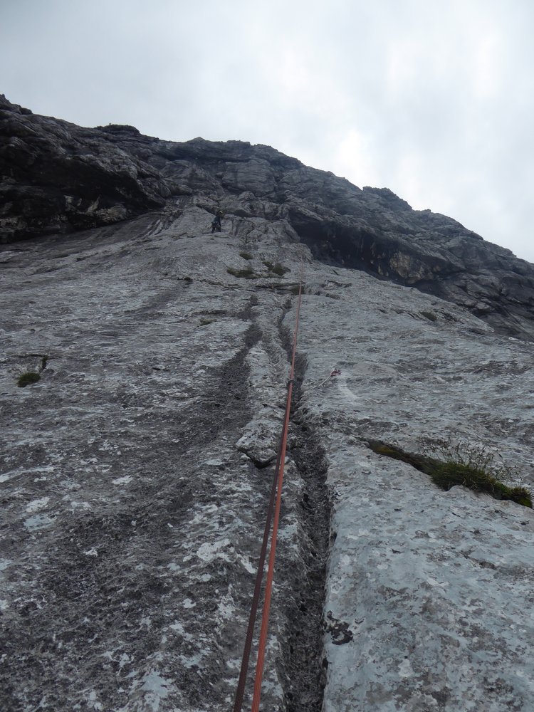 Logische Linie vom großen Altschneefeld bis zu Grasfleck mit zwei kleinen Bäumen, die im unteren Bereich teils schöne Wandstellen und Wasserrillen nutzt. Herrlicher, bombenfester Fels in der unteren Hälfte, ab der Schlüsselstelle ist etwas mehr Vorsicht geboten, da die Felsqualität nachlässt.