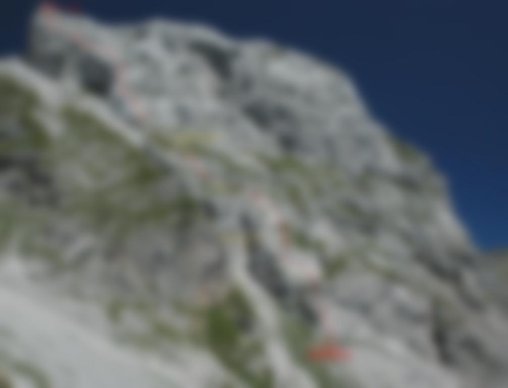 3.) Im oberen Teil vom Stand nach der 11. SL wenige Meter aufwärts in schrofiges Gelände und über dieses unschwer (2-max.3) aufs grasige Gipfelplateau südlich des Gipfels. Auch an den Folgeständen ist eine ähnliche Flucht nach oben möglich. Sicherung mit mobilen Sicherungsmitteln nötig.