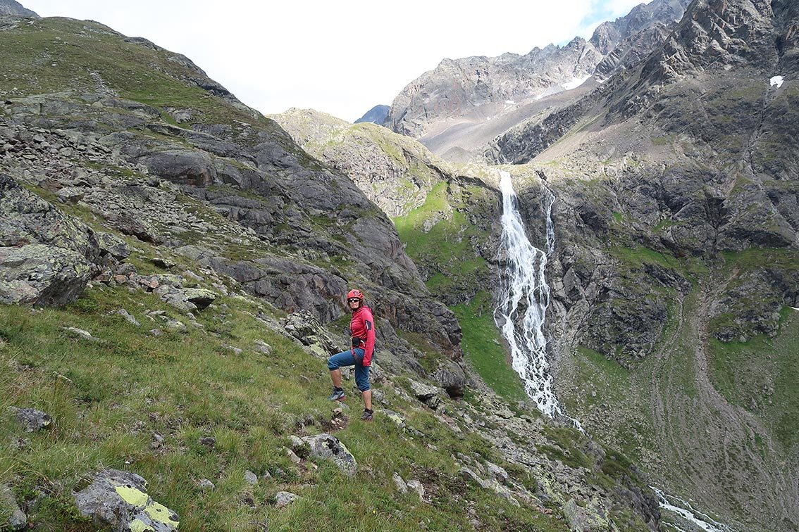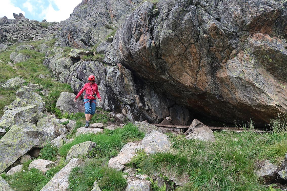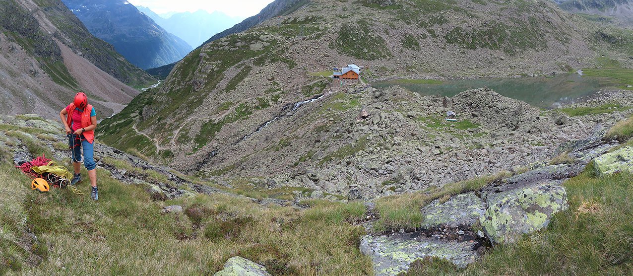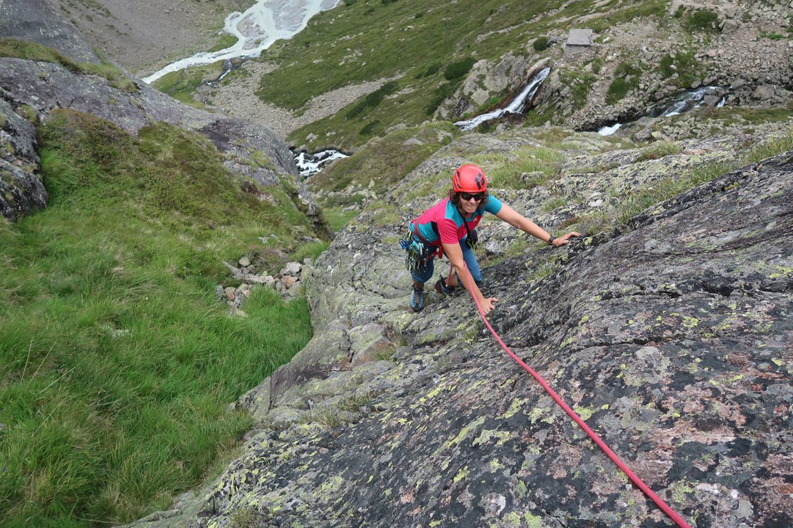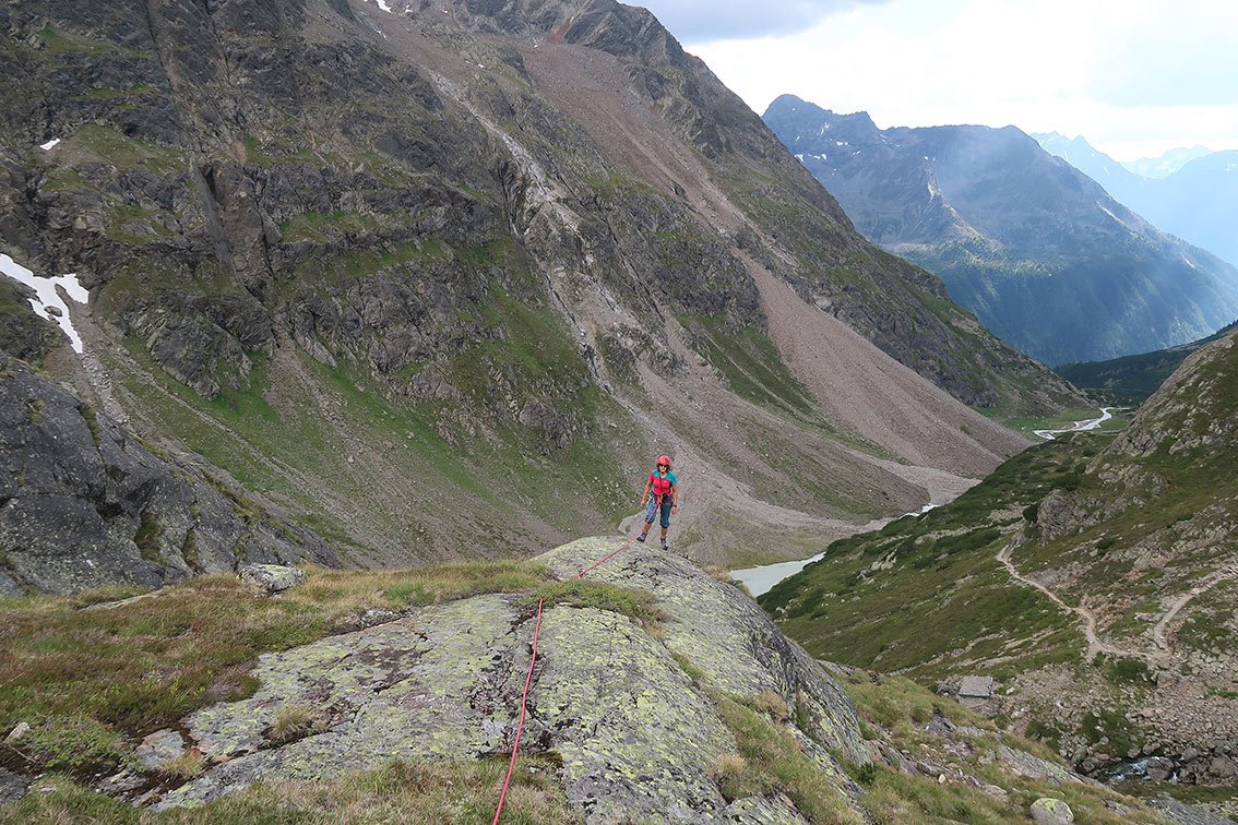Vom Ende der Klettertour steile (evtl. noch mit Seil) zu einem Grasabsatz und weiter zum nahen, markierten Wanderweg und auf diesem nach links zum Winnebachsee und zur Hütte absteigen. Dort auf dem Wanderweg zurück ins Tal.