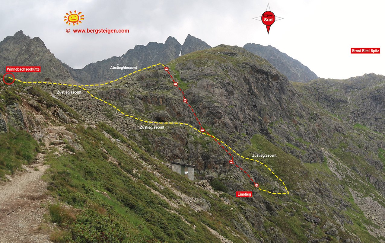 Vom Parkplatz der Winnebachseehütte zu der Häusergruppe Winnebach, von dort auf dem Wanderweg hinauf zur Winnebachseehütte. Hinter der Hütte über den Bach in Richtung Ernst-Riml-Spitze, gleich nach der Bachquerung aber südlich auf Pfadspuren absteigen. Nach einer höhlenartigen Nische quert man die Tour und steigt auf steiler Wiese in einem Bogen im steilen Gras zum Einstieg ab (siehe Topo und Übersichtsbild)