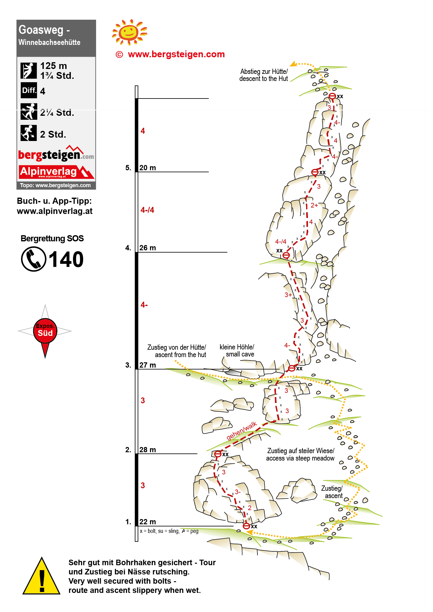 Der Goasweg ist eine fünf Seillängen Übungstour im Nahbereich der Winnebachseehütte. Der Anstieg ist sehr gut mit Bohrhaken ausgestattet, man kann diese Route auch gut mit festeren Bergschuhen klettern. Der Anstieg eignet sich gut als Zusatztour zum Gänsekragen Ostgrat, entweder für den Anreisetag, an dem man die schöne Landschaft um den Winnebachsee genießen kann oder man hängt die 5 einfachen Seillängen noch nach einer Gänsekragen Ostgratbegehung an.