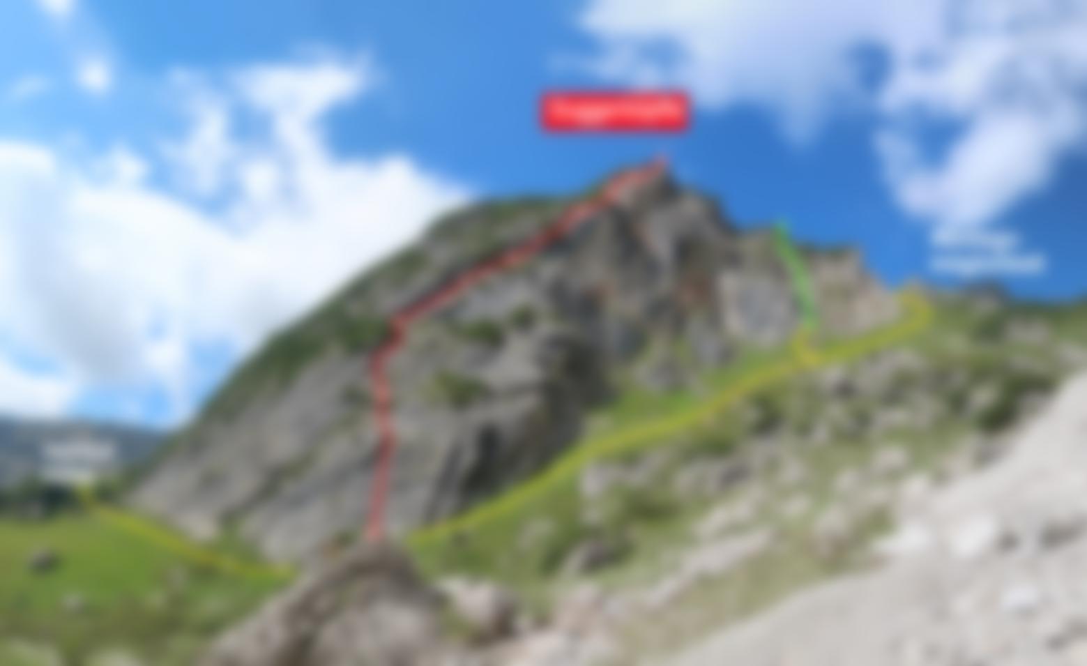 Von der Hütte folgt man kurz dem Weg in Richtung Guggersattele, zweigt dann aber rechts auf Pfadspuren ab und erreicht nach einer Geländekante den Klettergarten Guggerköpfle. Der Wand entlang bis zum Einstieg – der Name ist auf einer Metalltafel angeschrieben.