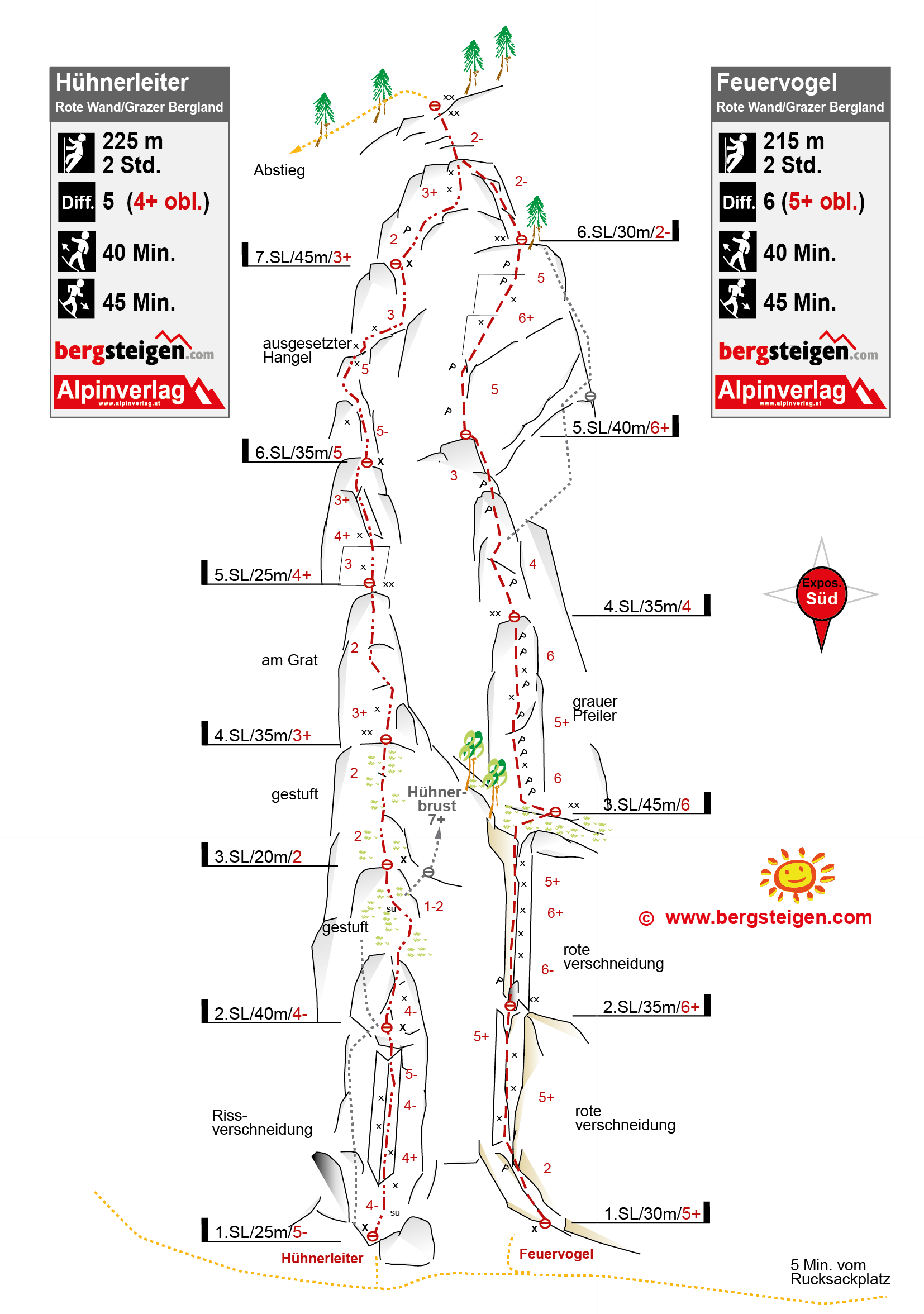 Vom Parkplatz der Roten Wand auf Forststraße in Richtung Buchebensattel, in der ersten Kehre auf gut sichtbaren Steigspuren nach rechts aufwärts bis zum Rucksackplatzl (Stein mit Holzbrett). Von dort (ohne Rucksack) links weiter zum Einstieg im Felsenwinkel bei der markanten roten Verschneidung vorbei zum Einstieg an der markanten Kante.