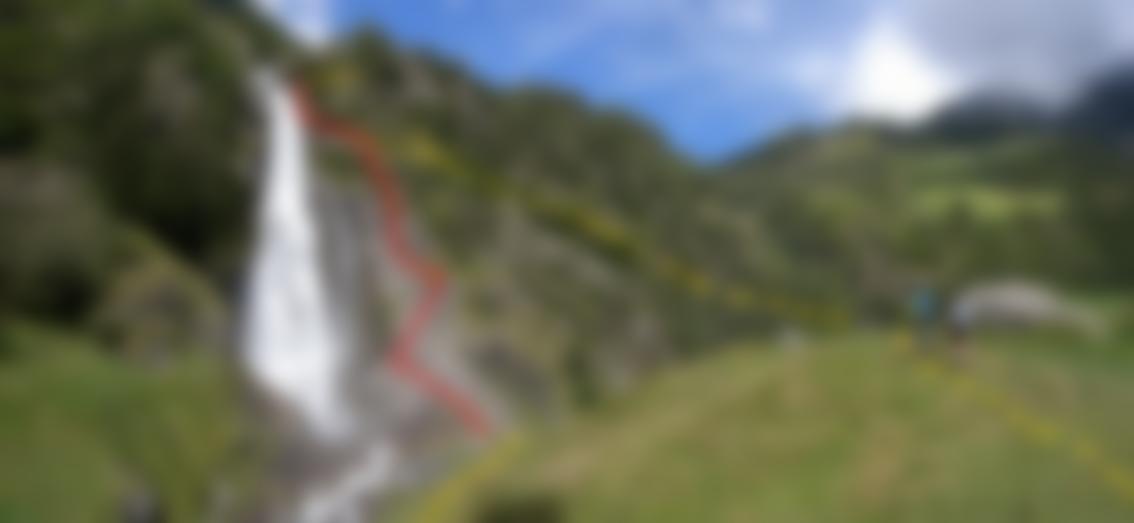 Die Tour verläuft direkt neben dem großen Wasserfall - vor allem bei Wind ist es oft nass! Die linke Möglichkeit in der Mitte und die letzte Seillänge sind bei viel Wasser nicht machbar (nass). Für Führungen und Abseiling empfehlen wir www.bergfuehrer-passeier.com