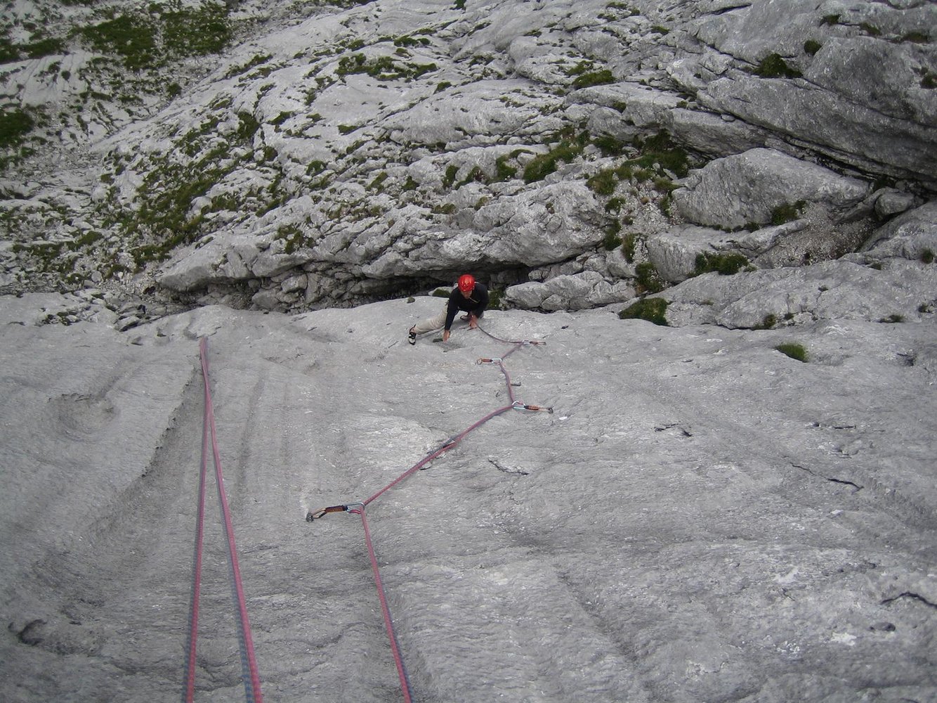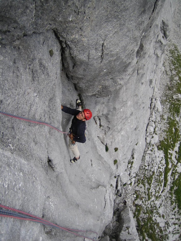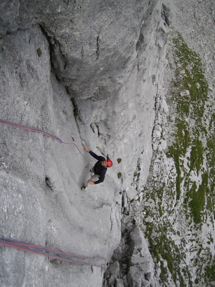 Großartige Tour durch kompakten Plattenfels, mit kniffligen Einzelstellen. Die letzte Seillänge ist leicht und unlohnend, man seilt daher am besten davor 2 x ab (siehe Topo).