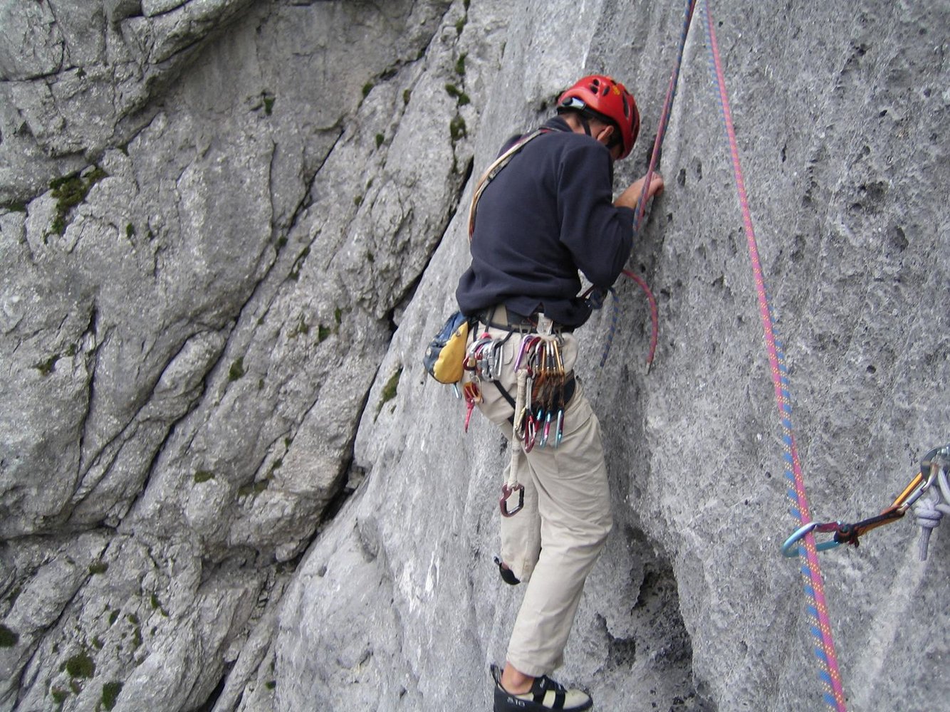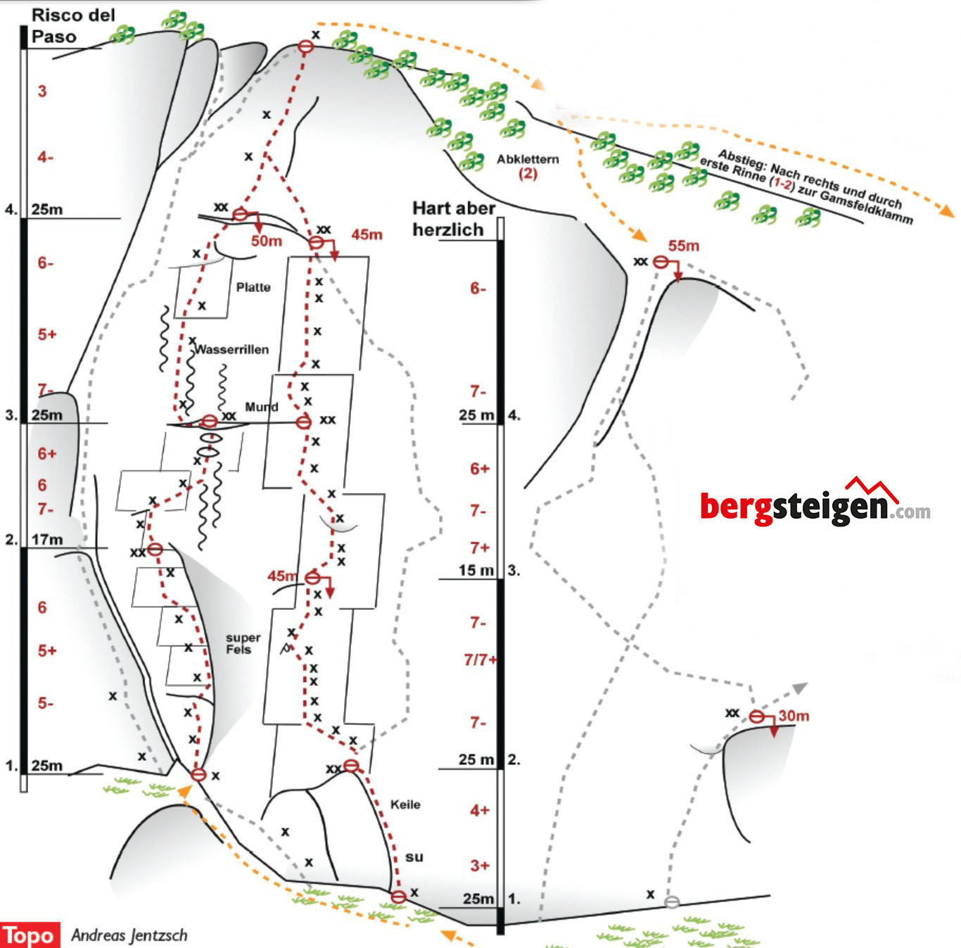 Wie Nördliche Südostwand, oder besser vor der letzten Seillänge 2 x über die Tour „Hart aber Herzlich“ abseilen (siehe Topo).