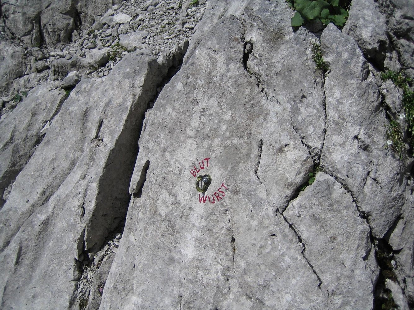 Wegen des losen Gesteins auf keinen Fall über die Tour abseilen, wenn noch andere Seilschaften in der Wand sind!