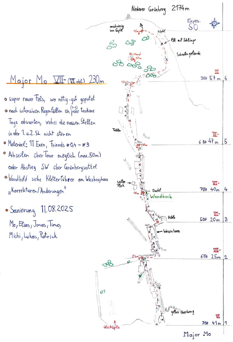 Sanierte Mehrseillängenroute. Absolut lohnende Riss- und Plattenkletterei. Die Route verläuft absolut logisch entlang der Risssysteme, vorbei an einem weißen Fleck und oben durch einen breiten Trichter. Die Schlüsselstelle (7-) in der Mitte erfordert Technik und Fingerkraft. Auch die Verschneidung (6-) sollte (vor allem bei Nässe) nicht unterschätzt werden. Das Platzieren von Friends macht die Route sicherer und rundet die Tour zu einer alpinen Mehrseillänge ab. Sie endet auf dem Niederen Grünberg (2174m), der durch leichtes, felsdurchsetztes Gehgelände erreicht werden kann. Vorsicht zwecks Steinschlag im oberen Wandbereich wegen nachkommenden Seilschaften und beim Abseilen! Helm! Nach Regenphasen etwas warten, bis die Route trocken ist (Wasserflecken kleiner werden).