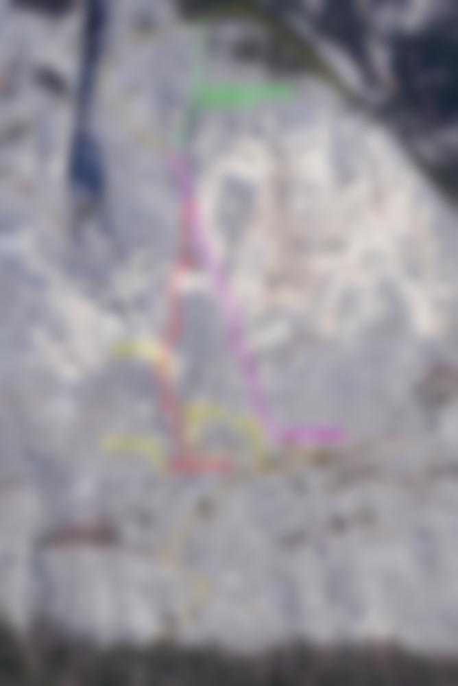 4 x über die Route abseilen oder die “Auckenthaler“ zu Ende klettern. Vom Buch den kleinen roten Punkten bis zum Aufbauplatz "Auckenthaler" folgen, dort in östlicher Richtung leicht absteigen (blasse Punkte) bis zum nächsten "Aufbauplatz" der Bergrettung mit Materialkiste - bis dorthin Schrofen bis zum ersten Grad! Von dort dem gut ausgetretenen Abstiegsweg folgen.
