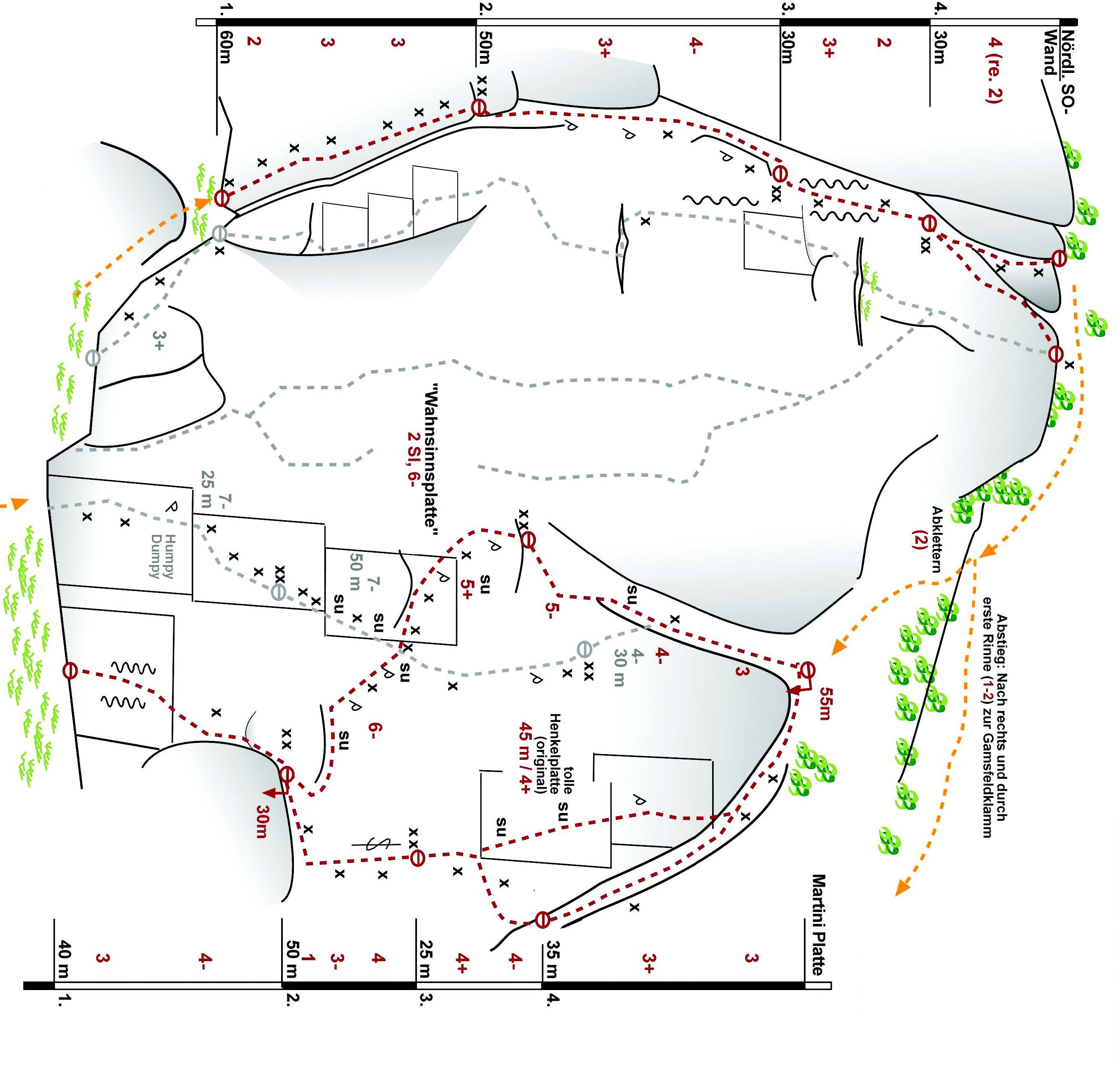 Vom Ausstieg in wenigen Schritten links zum Gipfel (Buch). Weiter nach Osten, bis Steigspuren einen Abstieg rechter Hand in die Gamsfeldklamm ermöglichen (20 Min. zum Einstieg).