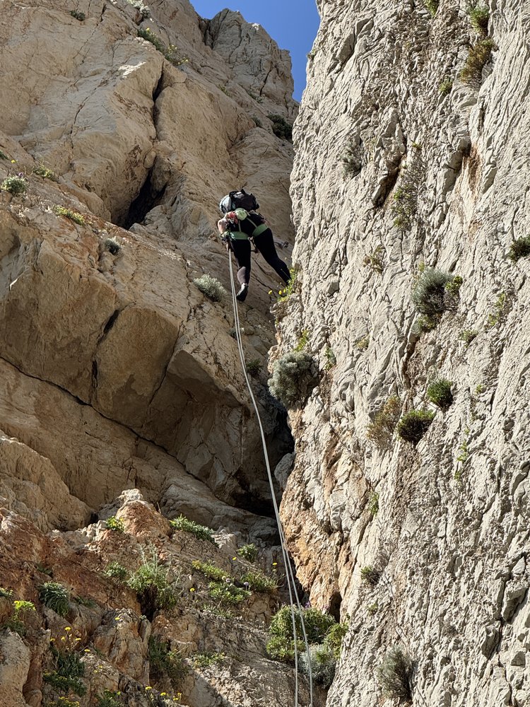 Vom Gipfel den Grat (Steigspuren) weiter folgen, über 2 Abkletterstellen (I - II) zu einem etwas versteckten Abseilstand (Bohrhaken). Von hier Richtung Turm abseilen in eine Scharte (25m). Von der Scharte über eine Rinne zum Boden (30m). Von dort über einen sichtbaren Steig zum Einstieg.