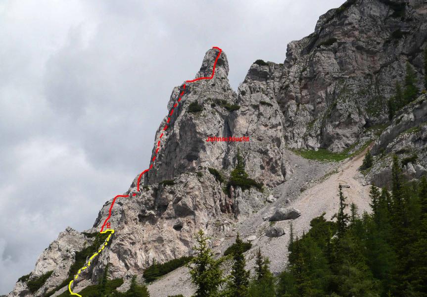 Vom Ghf. Moassa zur Karreralm und auf dem Weg zum Großen Fuchsloch bis etwa zur Baumgrenze. Rechts des Weges befindet sich eine Jagdhütte (etwa 100 Hm unter dem Fuß des von hier sehr gut sichtbaren Paulaturms). Links zweigen Steigspuren ab, auf denen man rasch - die Geröllhalde querend - in eine konkave Wandbucht gelangt. Hier Einstieg (bezeichnet).