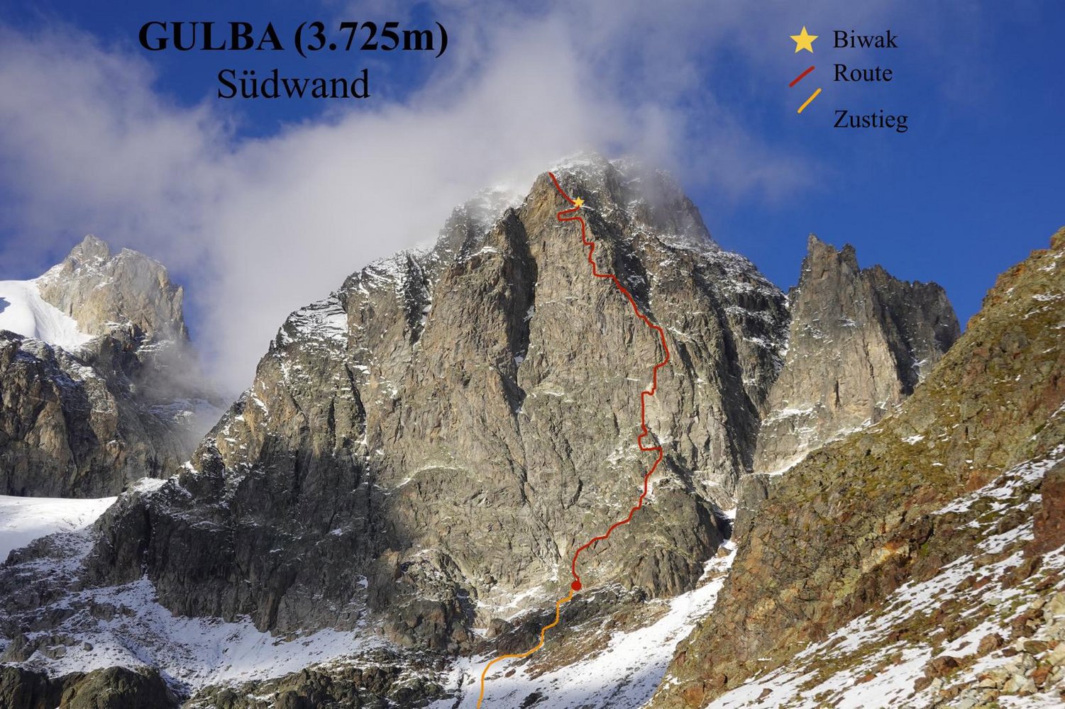 Vom Basecamp (Wasser vorhanden) auf ca. 2900 hm auf den Weg hinauf zum Gedenkstein für am Südgipfel des Ushbas verunglückte Bergsteiger. Weiter über den markanten Moränenrücken direkt zu dem Fuß des Gulbas. Über losen Schotter bzw. Schnee (je nach Bedingungen) die letzten Höhenmeter hinauf zum Einstieg am Vorbau des rechten Pfeilers der Gulba Südwand.