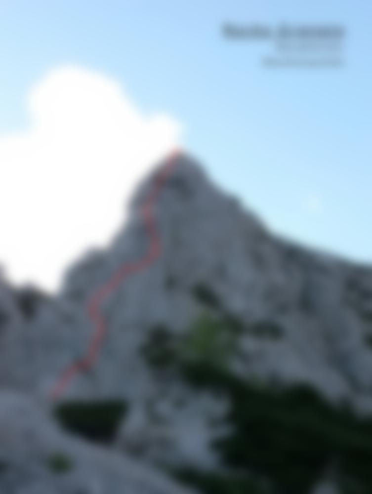 1. SL (6): Einstieg bei Schlaghaken mit Schlinge. Von diesem leicht rechts zum Beginn einer Verschneidung. Diese verfolgen bis sich brüchiger Fels einstellt. Dort nach links über Bauch ausweichend zu Stand. 2. SL (7/6+A0): Gerade hoch, dann Querung unter Bauch. Diesen mittels Blockierer auf richtige Leiste überwinden (A0 mögl.). Nun horizontal rechts noch einige Meter in kniffliger Platte zu Stand um Kante. 3. SL (7-): Riss gerade hoch bis sich dieser verläuft. Dort nach links in 2. beginnenden Riss wechseln. Nicht nach rechts zu rotem Verhauerhaken! Leicht überhängend über Wandl und nach links in leichter werdendes Gelände zu Stand. 4. SL (8/6+A0): Über Rechtsschleife unters Dach. Stark abdrängend aus diesem nach rechts über Leisten auf Henkel. Zuletzt ebenfalls tendenziell rechtshaltend zu Stand.