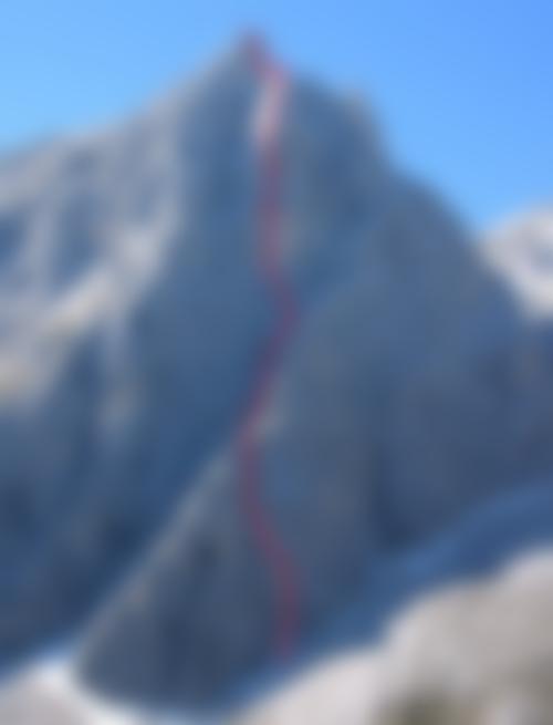 "Schrei aus Stein“; Kletterlänge vom Wandfuß ca. 650 Meter bis zum Ausstieg; 750 bis zum Gipfel; Schwierigkeitsvorschlag 9-/9 im Rotpunktdurchstieg (8- obl.). Rest siehe Topo.