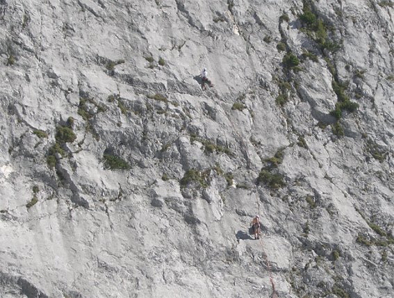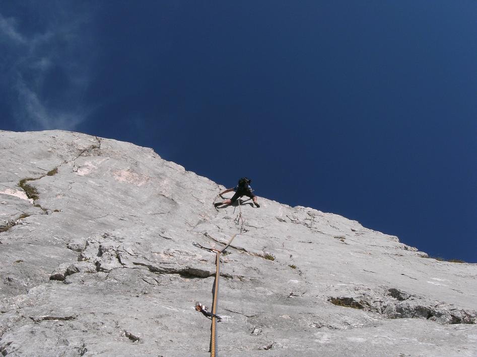 Absicherung ist ausgezeichnet. Trotzdem muss man zwischen den Haken schon selbst klettern. Mit nur A0 geht nichts.