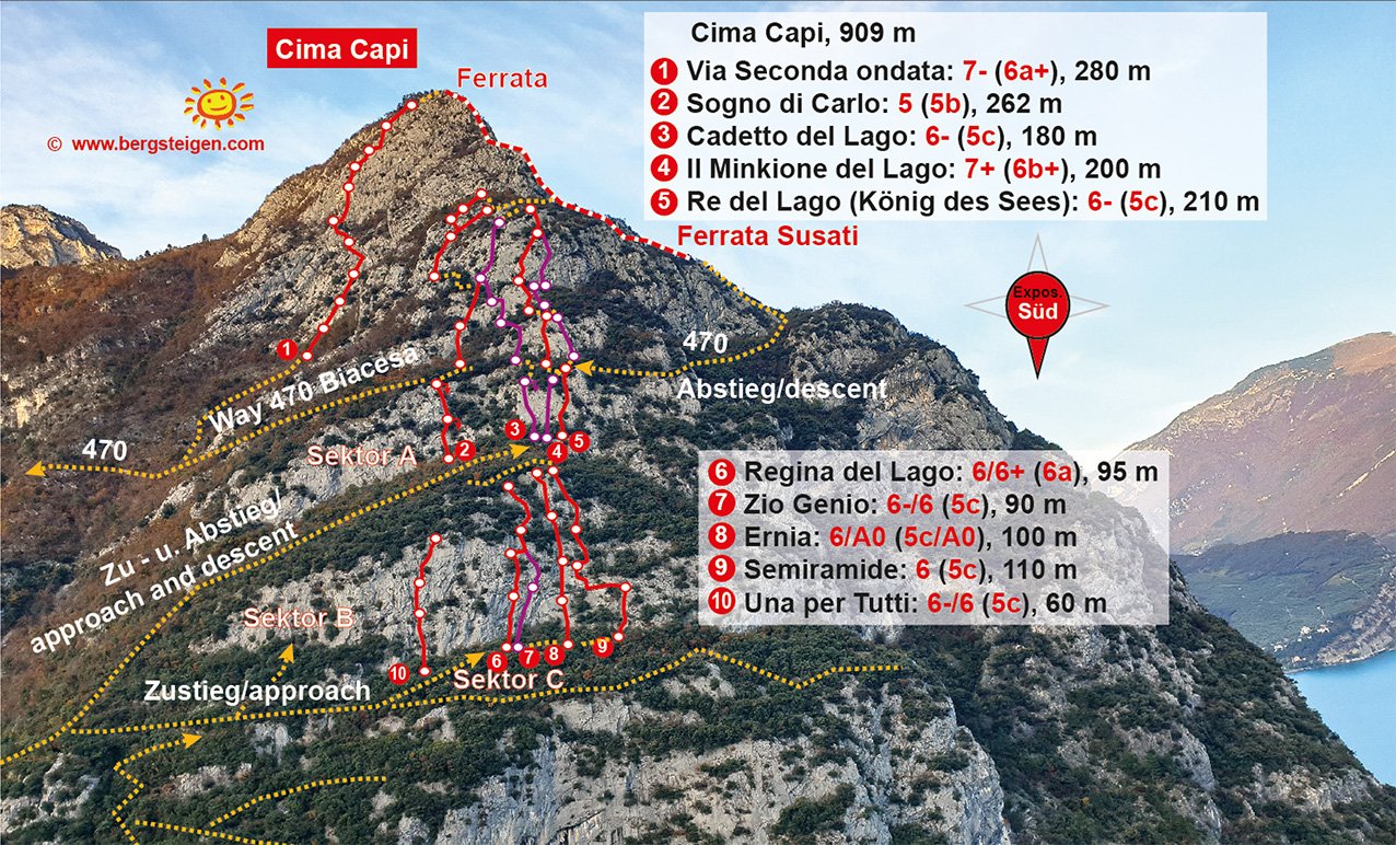 Vom Parkplatz auf der Straße zum Tunnel zurück und rechts davon auf der alten Ponalestraße (anfangs auch durch kurzen Tunnel) ca. 300 m weiter, bis links am Ende einer kleinen abfallenden Mauer ein Weg abzweigt (Wegweiser, Holzgeländer). Diesem Weg zu aufwärts bis zum mittleren Sektor (B-C-D) des Klettergartens folgen. An den ersten Kletterrouten vorbei, rechts von einem steilen Klettergartenteil (twl. gelber Fels, überhängende Routen) kommt man zum Podest mit der "Regina del Lago" Route (Tafel). Von dort rechts leicht absteigen, an der "Ernia" (Tafel) vorbei zum Einstieg an einer schönen, strukturierten Platte.