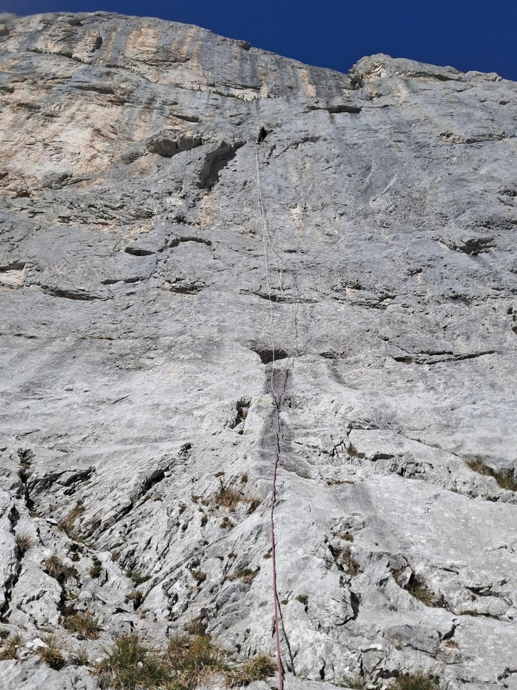 Leicht nach Links und dann gerade hoch. Danach nach links "ausmanteln" und dann über die Platte nach rechts. Nun gerade hoch, schwieriger werden auf kleine Leisten. Am Ende nach rechts raus queren und zu guten Standplatz bei Latschen.