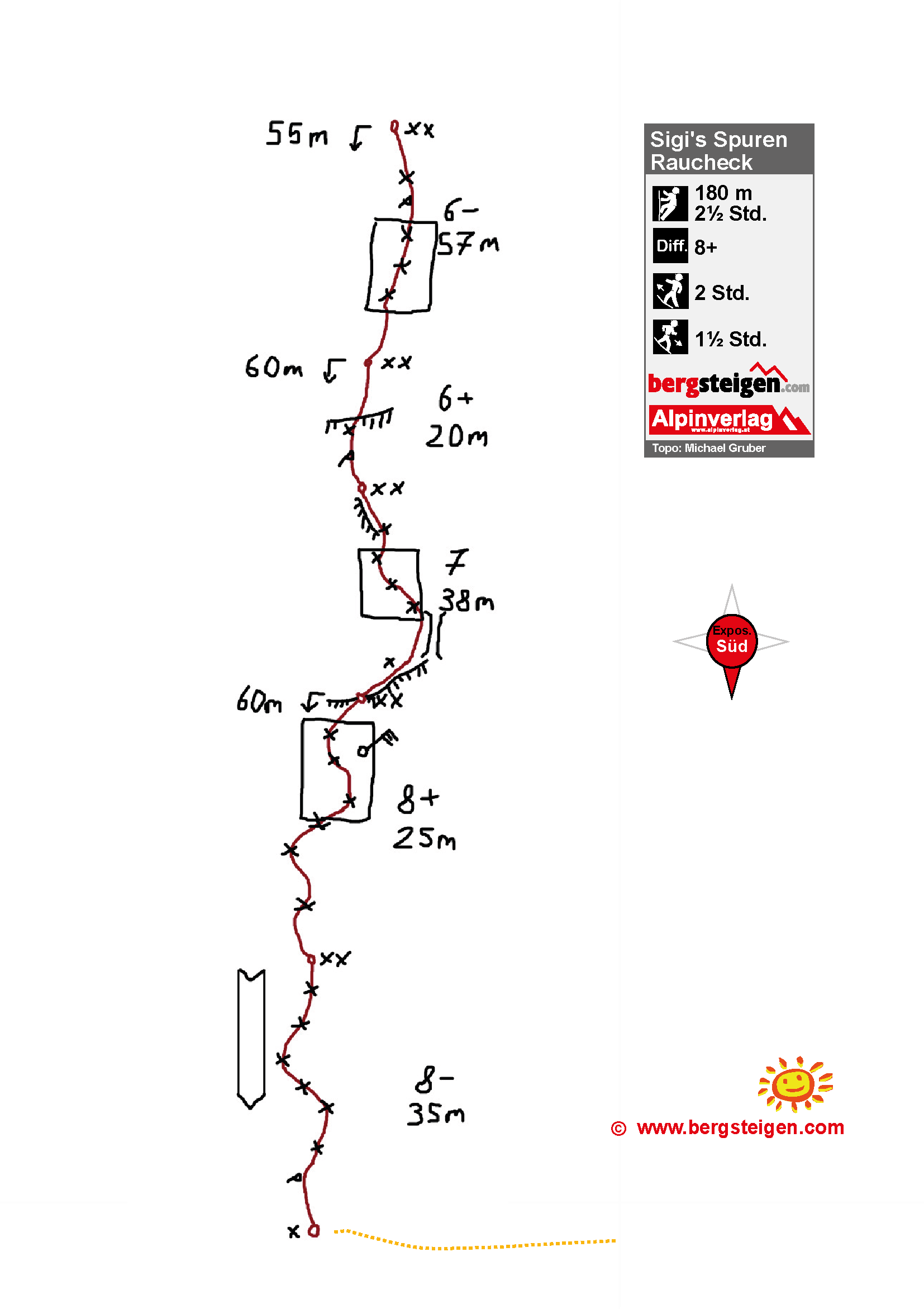 Name kommt von den Spuren von Sigi Brachmayer in der Rumpelkammer. Wir haben seine alte "Box" entdeckt und natürlich steht auch sein Marterl hier heroben. Man sieht auch auf der Nordseite vom Hiefler 2-3 roten Haken einer mir unbekannten Tour.