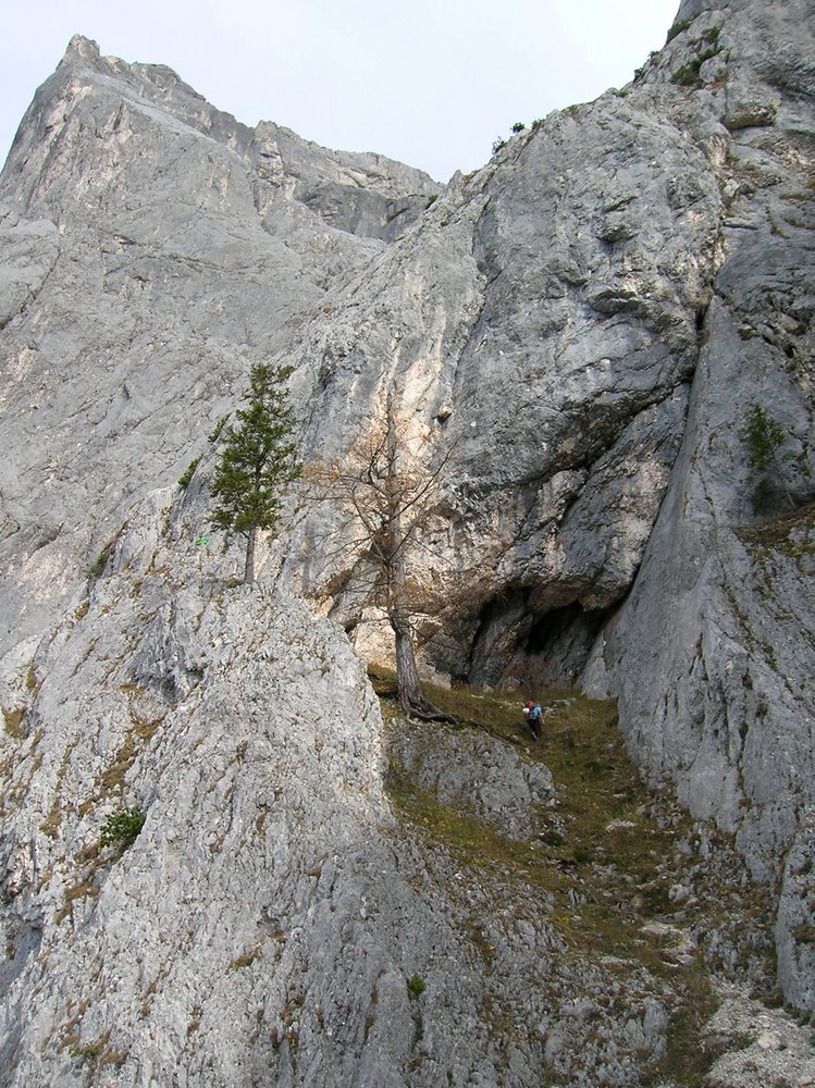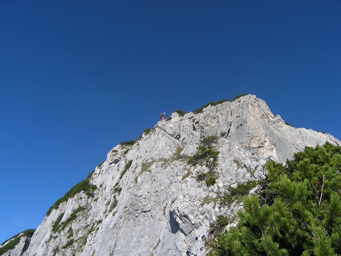 Vom Ausstieg 200 m auf Steigspuren ausgesetzt zum Gipfel mit dem Kreuz. Von dort auf den markierten Wanderweg vorbei am Ahornkogel hinunter zum Tressensattel absteigen.