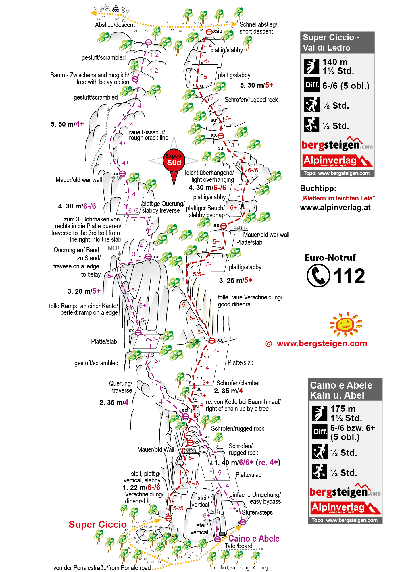 Sehr gut abgesicherte Plaisir-Route, welche im Bereich der beliebten Kain und Abel Tour verläuft und diese im unteren Teil kreuzt. Geringe Schwierigkeit, schöne, abwechslungsreiche Kletterpassagen und vor allem die sehr gute Absicherung machen die Route zum Publikumsmagneten. Sehr schöne Route, die man gut mit den anderen Mehrseillängen-Routen an den Ledro-Felsen verbinden kann.