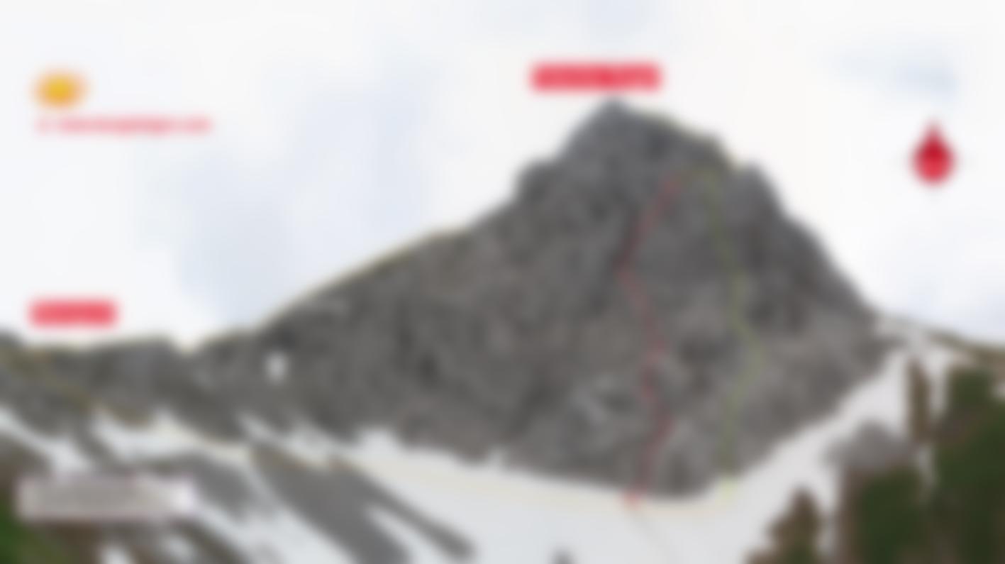 Vom Grasband bzw. der Schrofenrinne (dort endet im Grunde die Tour) nach rechts um die Ecke. Nach der Ecke links im Schutt hinauf und oben den Steinmännchen folgend über leichte Schrofen (Stellen 1) hinauf zum Wanderweg. Von dort kann man nach rechts in ein paar Schritten hinauf zum Gipfel steigen.