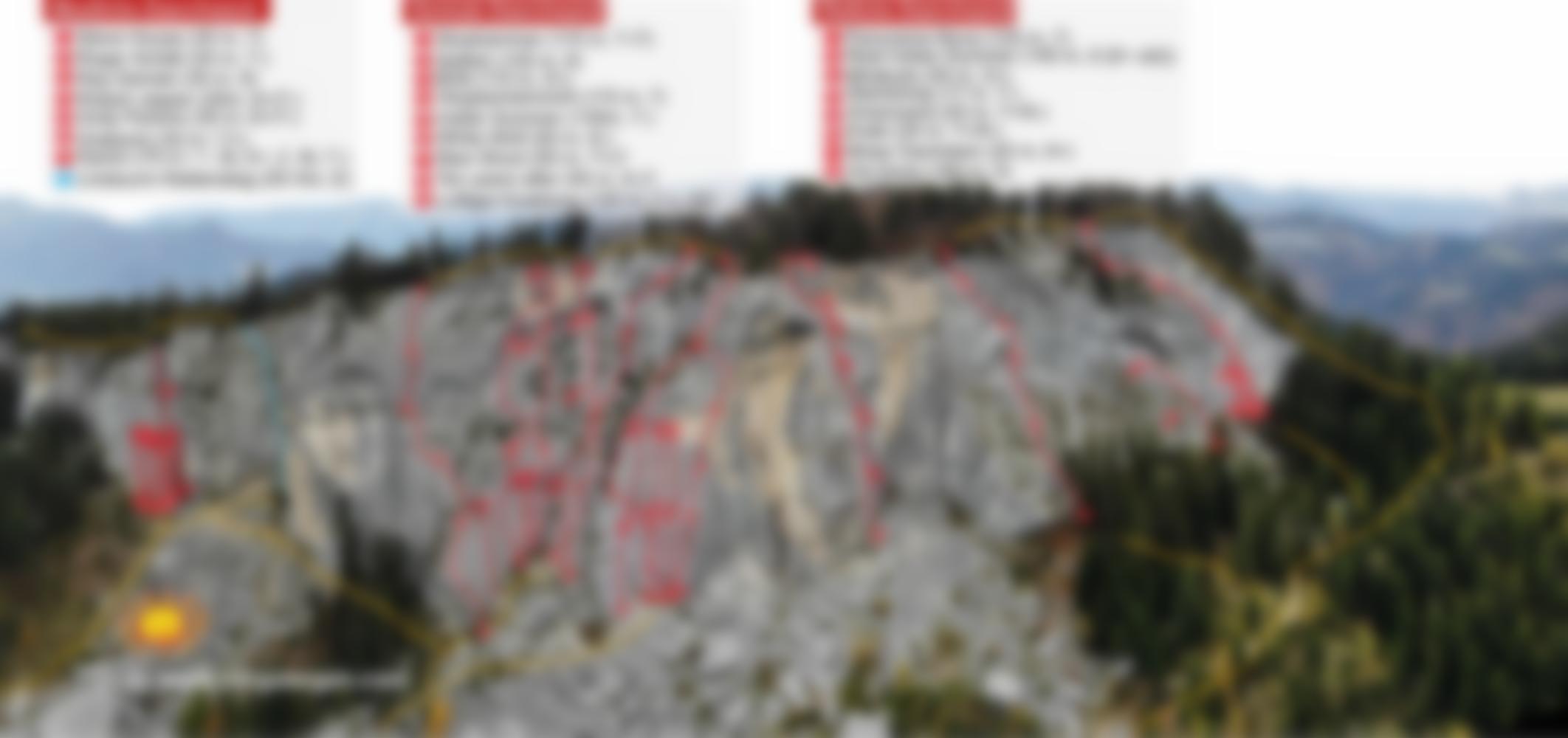 4 x 25 m über die Route Vergissmeinnicht abseilen.. Alternativ zu Fuß oben der Wand entlang nach Westen und vor einem Gipfelkreuz rechts zum Hütteneck-Rundwandweg absteigen und diesem nach Süden zur Forststraße folgen.