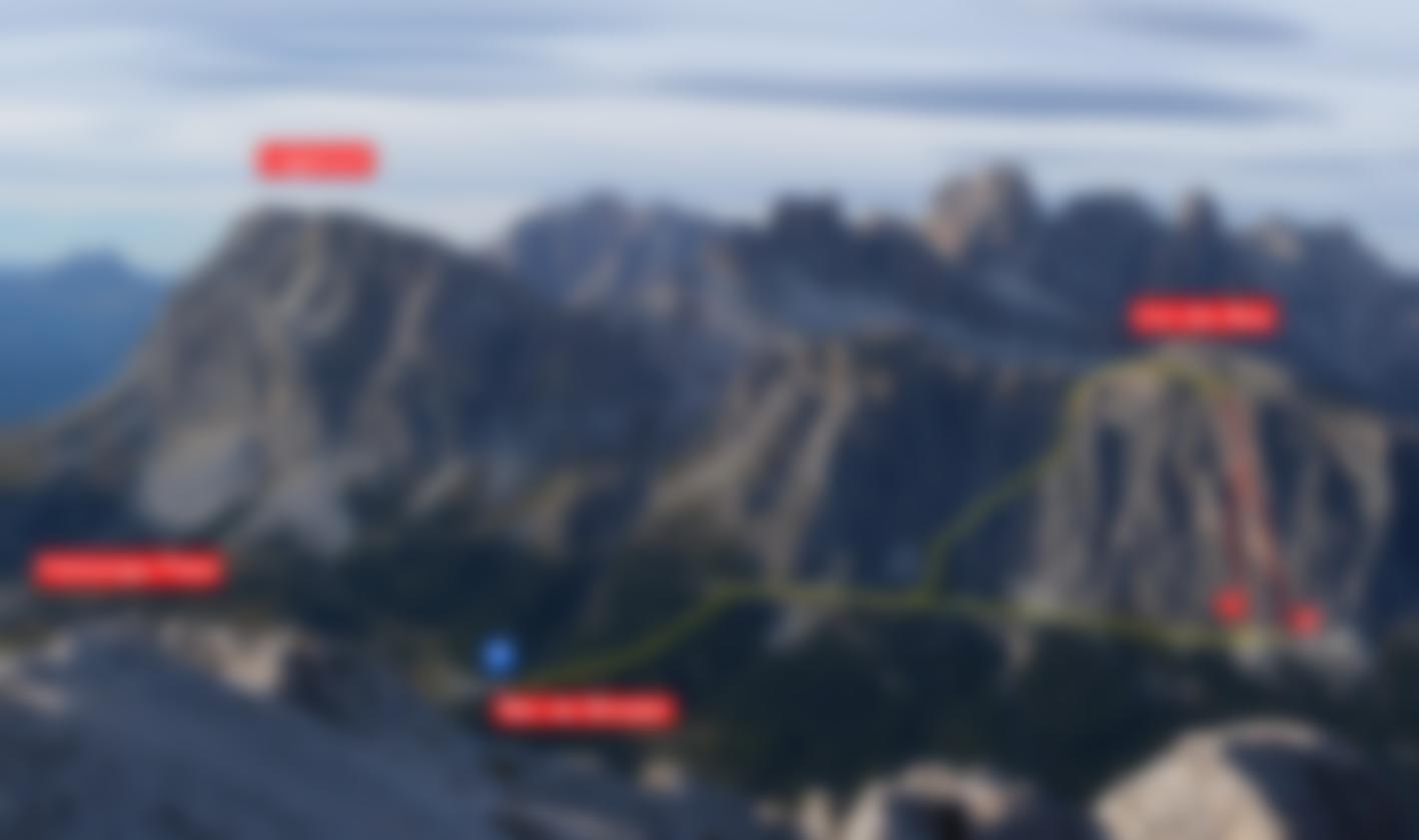 Vom Endpunkt der Tour nach links (westlich) zum Ausstieg des Klettersteiges. Von dort am deutlichen Pfad weiter nach Westen und in der breiten Schlucht zwischen Falzaregotürmen und Col dei Bos zum ehemaligen Lazarett (Ruinen) absteigen. Von dort auf dem schon bekannten Zustiegsweg zurück zum Auto.
