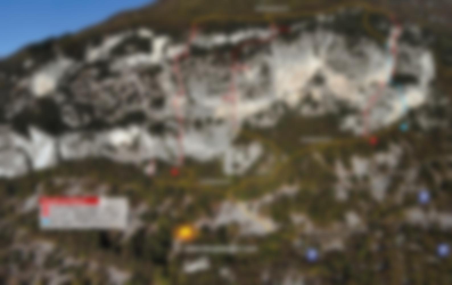 Vom letzten Stand noch etwas aufsteigen, bis Steinmänner nach links leiten und später auch über eine Felsstufe hinaufführen. Danach quert man ca. 10 Minuten, über dem Wandfuß oft auch an einer Wiese-Waldgrenze über der Wand nach Süden (Gardasee) und steigt zuletzt im Wald zu den Felsen mit Wandbuch und erster Abseilstelle (20 m) ab. Nach dem ersten Abseiler geht auf einem Felsband kurz orografisch nach rechts (Süden) in den Wald. Dort führt ein Pfad steil und felsdurchsetzt (UIAA 1-2, Sanduhr und blaue Striche) steil hinunter zur nächsten Abseilstelle (ca. 35 m). Die letzte Abseilfahrt führt 50 Meter frei hängend auf den Vorbau bei einer Schlucht. NICHT in die Schlucht weiter abseilen, sondern auf den Vorbau wechseln und von diesem nach Norden zum Wandfuß abklettern (1-2). Nun auf deinem Pfad weiter absteigen und links zur Kehre zurück.