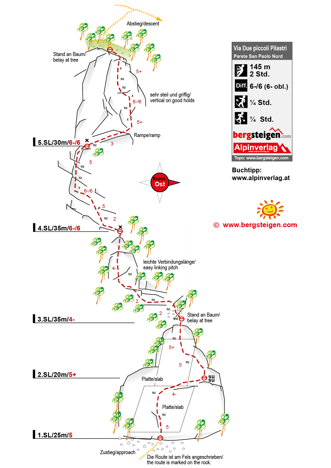 Schöne Kletterroute an der Parete San Paolo Nord, die nach oben hin immer schwieriger und steiler wird. Die Tour führt über zwei Pfeilersysteme, von denen das erste Plattenkletterei an guten Griffen und der zweite Pfeiler immer steiler werdende Wandkletterei an großen Henkeln bietet. Die Kletterroute liegt direkt über dem Parkplatz bei der Einsiedelei.