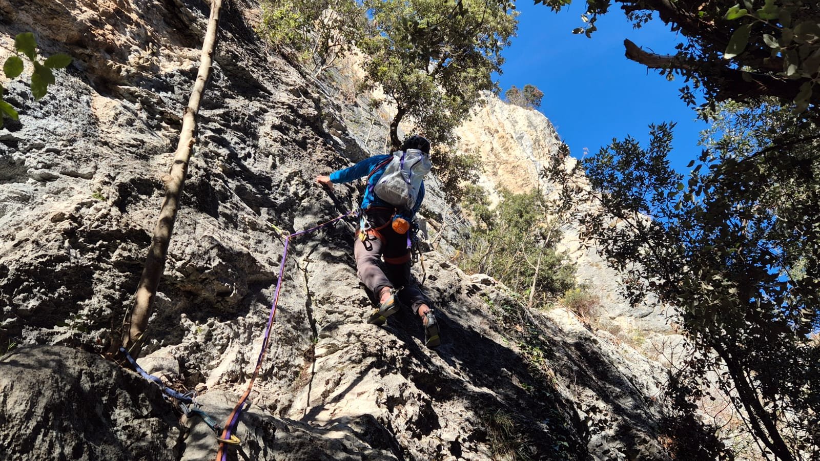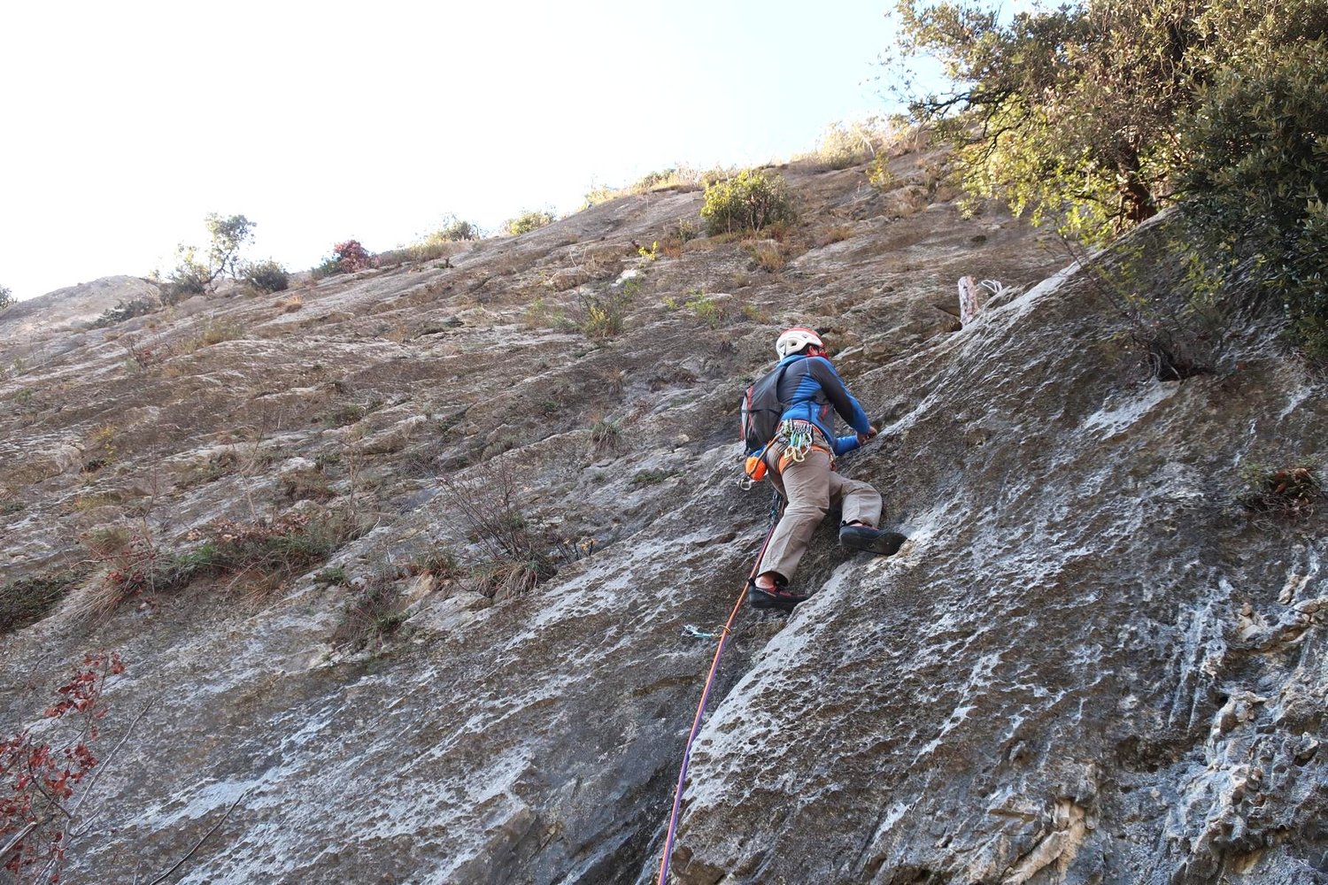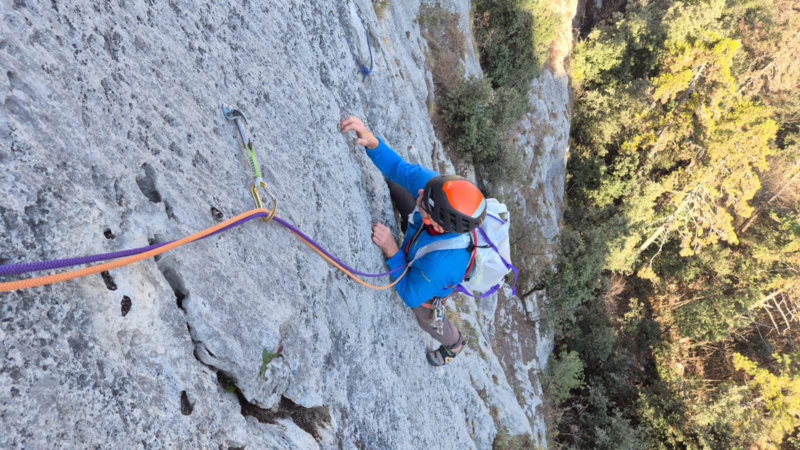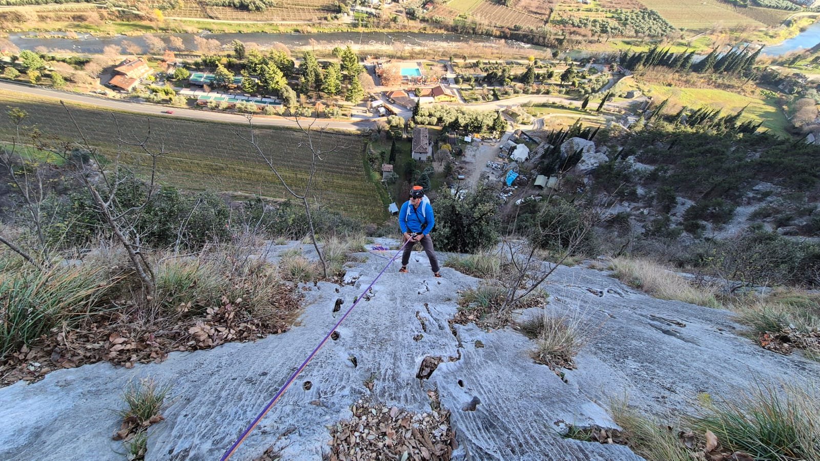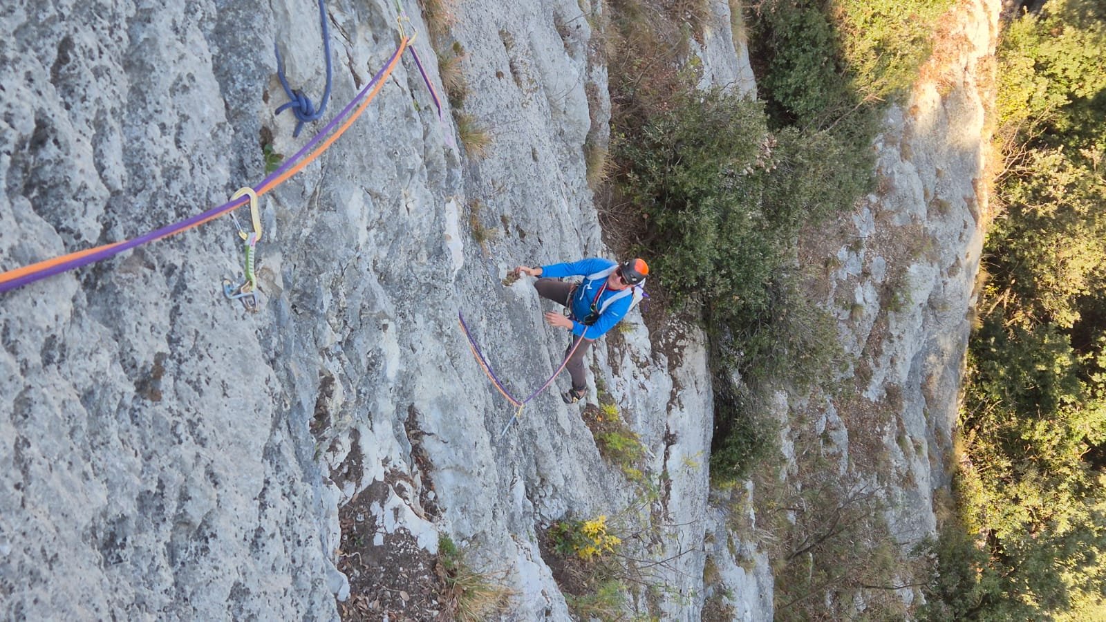 Die Via Giada Kurwi verläuft links der großen Verschleierung an den Placconata Platten nach oben. Und bietet schöne, aber im leichten Gelände auch etwas erdige und derzeit (Dezember 2025) noch etwas brüchige Kletterei. Wegen der recht guten Absicherung, den kurzen, nicht allzu anspruchsvollen Seillängen erfreut sich diese Route großer Beliebtheit.
