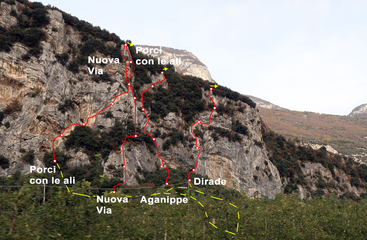 Sehr guter San-Paolo-Klassiker mit Plaisirabsicherung. Die Route verläuft immer unterhalb von Dachzonen an schönem Tropfsteinkalk (schon etwas abgeklettert). Die schweren Passagen sind steil bzw. leicht überhängend, aber kurz und eher schmerzlos zu klettern. Die Tour gehört zu den besten San-Paolo-Touren – Arcobesucher sollten sie auf der Liste haben.