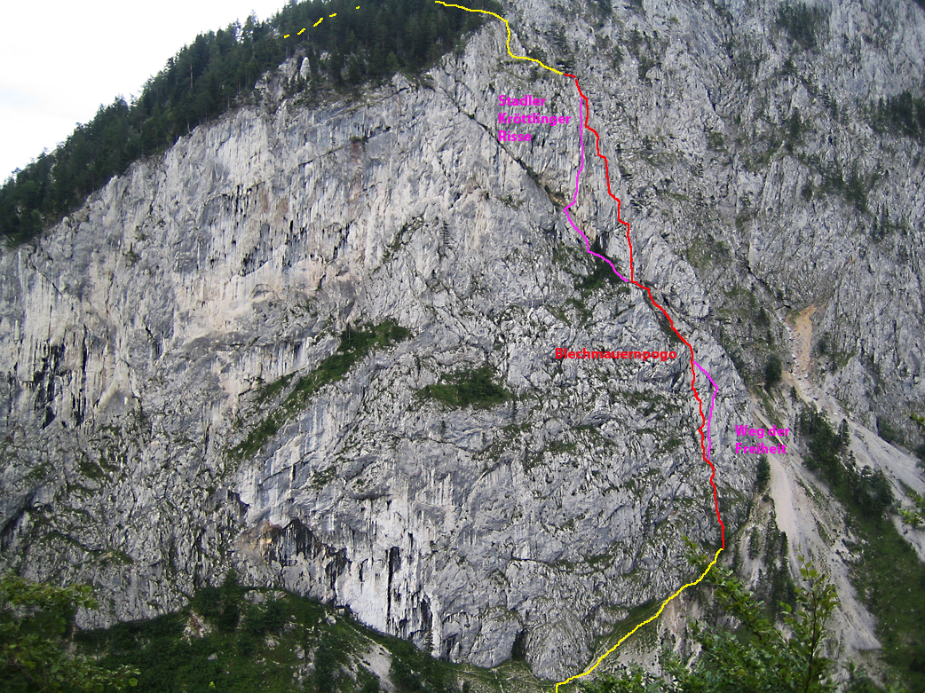 Kombination von zwei Klassischen Blechmauern Kletterrouten, die nachträglich gut mit Bohrhaken saniert wurde. Die Kletterrei bietet durchaus anstrengende Riss- und Verschneidungskletterei und hat trotz der uppigen Sanierung einen Alpinen Touch.