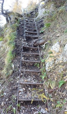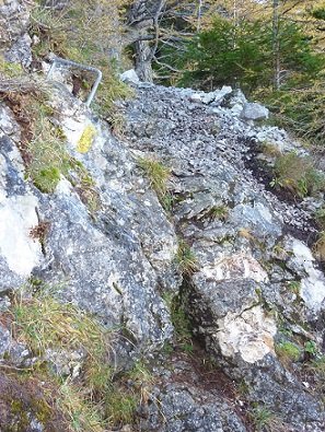 Eine kurze ungesicherte Passage die im Abstieg für weniger Trittsichere etwas unangenehm sein kann.