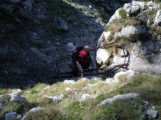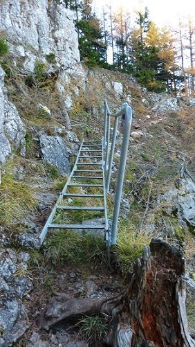 Vor den ersten Versicherungen wartet ein kurzes ungesichertes Stück auf den Bergsteiger. Danach gleich eine kurze steile und nicht ganz stabile Leiter mit sagenhaftem Tiefblick. Es folgt eine kurze Seilversicherung. Relativ weit oben wartet dann noch eine letzte Leiter zur Überquerung einer Schlucht. Danach gibt es keine Schwierigkeiten mehr. Am Ende trifft man auf den Gsolhirnsteig (blaue Markierung) und biegt rechts hinauf Richtung Bergstation der Raxseilbahn.