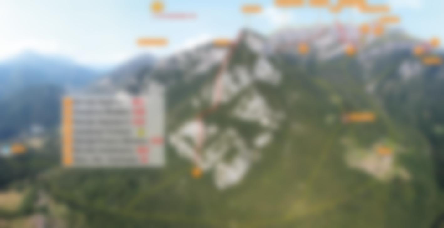 Siehe Topo. Die schwierigen Passagen sind an Pfeilern und kurzen Aufschwüngen.