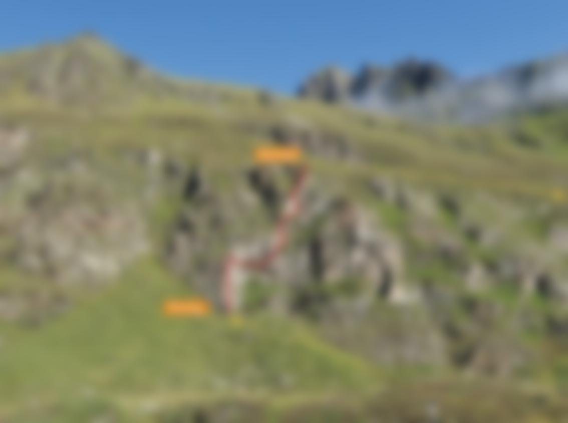 Siehe Topo. Einen steilen Pfeiler (C) empor und nach rechts queren (B, Stelle B/C). Über Stufen (C) in flacheres Gelände (B bis B/C) und weiter zum Ausstieg (A).
