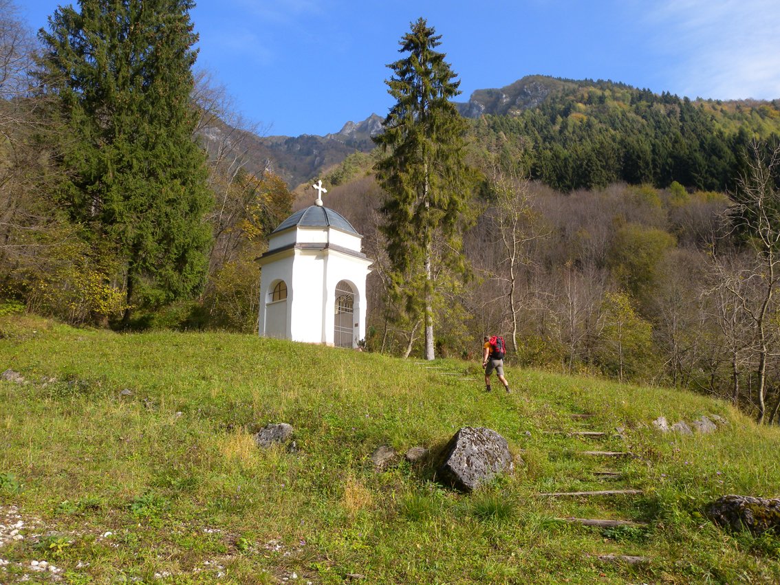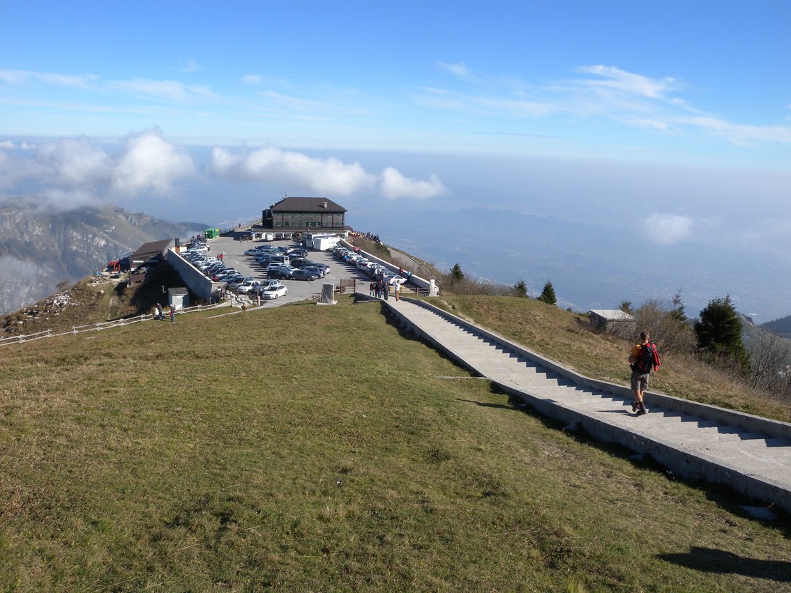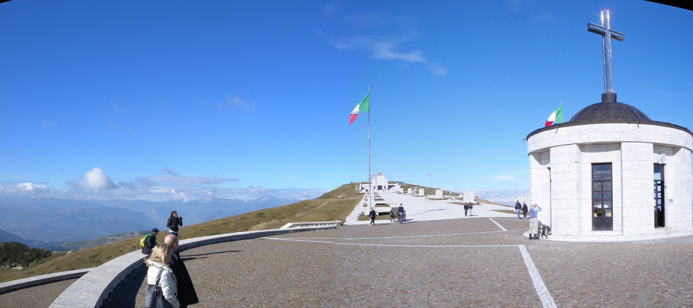 Vom Ausstieg steigt man weiter zum Rifugio Bassano auf und geht von dort gerade über die Treppe hinauf auf den Gipfel des Monte Grappa. Vom Rifugio Bassano (gleich beim Gipfel) folgt man den Weg in Richtung San Liberale nördlich hinunter zur Malga Val Vecchia. Dort stiegt man weiter in Richtung Osten zur Straße ab und geht auf dieser nach links zur flachen Wiese "Pian de la Bala". Von dort südöstlich auf dem Militärweg direkt ins Valle di San Liberale absteigen. Man kann schon etwas unterhalb des Rif. Bassano nach rechts zur Malga Val Vecchia gehen (170 Hm weniger, 50 Min. kürzer), das gewaltige Monument auf dem Monte Grappa Gipfel sollte man sich aber nicht entgehen lassen.