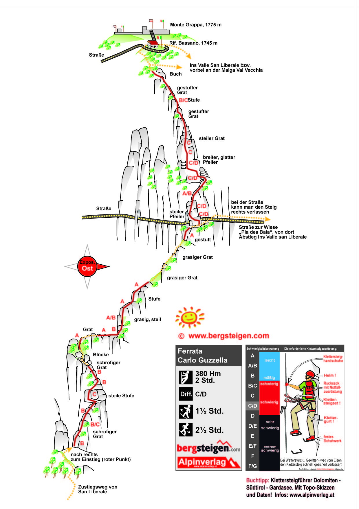 Schöner Klettersteig der über die "Direttissima" auf den Monte Grappa führt. Der Gipfel des Monte Grappa ist wegen des von den Faschisten errichteten riesigen Kriegsmonuments ein einzigartiger Platz, von dem man bei klarem Wetter sowohl die Adria als auch die Alpengipfel sieht. Der komplette Berg wurde mit Militärstraßen und Wegen überzogen, man kann von Bassano mit dem Auto bis zum Gipfel fahren. Wer also an der Adria Urlaub macht, kann den Klettersteigen Ferrata Carlo Guzella und Ferrata Sass Brusai im Valle di San Liberale einen Besuch abstatten. Im Sommer ist es an den südseitigen Touren meist sehr heiß.