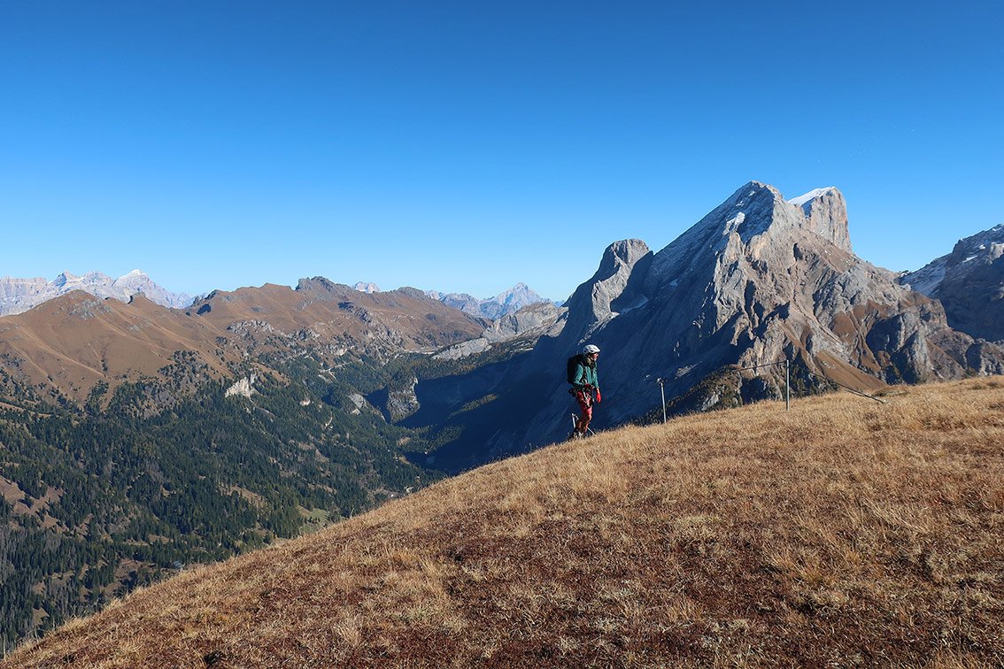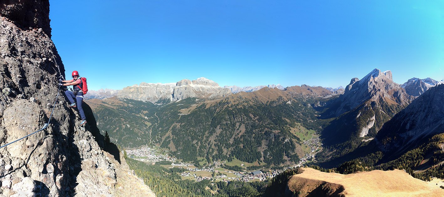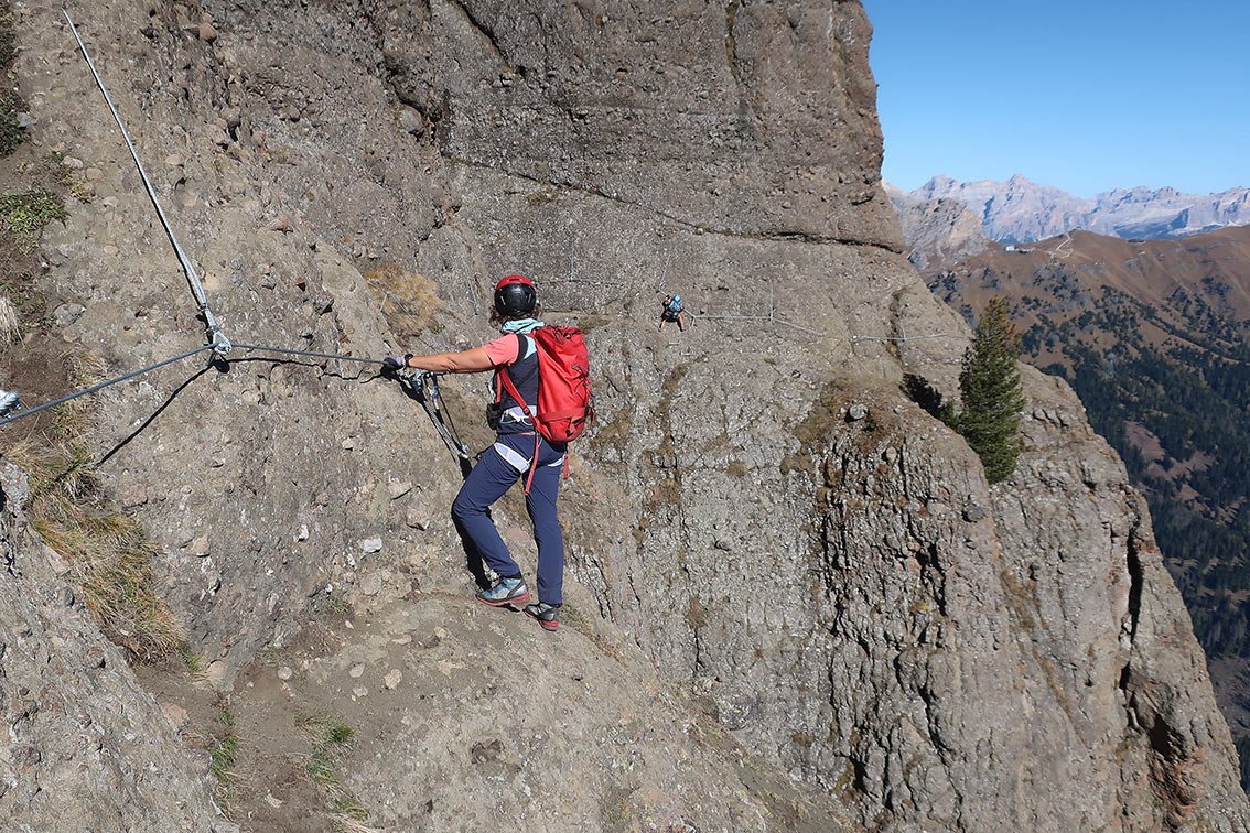Die Crepa Neigra ist ein kleiner Konglomeratberg mit vulkanischem Ursprung (Neigra = Schwarz) und primär um diesen Berg wurde eine Ferrata angelegt. Man steigt zuerst ein paar Meter auf, eine Seilleiter sorgt für Abwechslung. In halber Wandhöhe beginnt man dann mit der sehr langen Querung, aus der man in der Mitte schon auf den Wiesengipfel aussteigen kann. An der Ferrata wurden rund 500 m Stahlseil verbaut, die meisten Meter davon in der Horizontalen. Wer das Traversieren bis zum Ende durchhält, wird mit ein bis zwei ausgesetzten Passagen belohnt. Die Ferrata Crepa Neigra ist ein klassischer Mainstream-Klettersteig in Seilbahnnähe und spricht wegen der geringen Schwierigkeiten eher Ferrata-Einsteiger an. Der Klettersteig bietet im wahrsten Sinne des Wortes (lange Querung) ein perfektes, lang anhaltendes Dolomiten-Panorama!