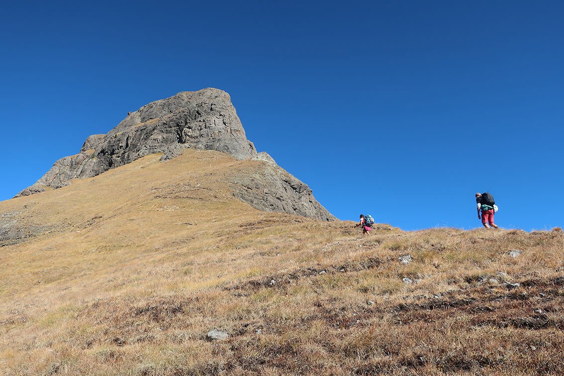 Auf dem Wiesengipfel zum Abstiegsklettersteig (siehe Topo). Vom Ende der Seilsicherung am Nordwestgrat folgt man dem Weg etwas bergab und geht dann unterhalb der Südwand der Crepa Neigra zurück zum Sattel Pain de Sele und von dort auf dem schon bekannten Zustiegsweg hinunter zur Ciampac-Seilbahn.