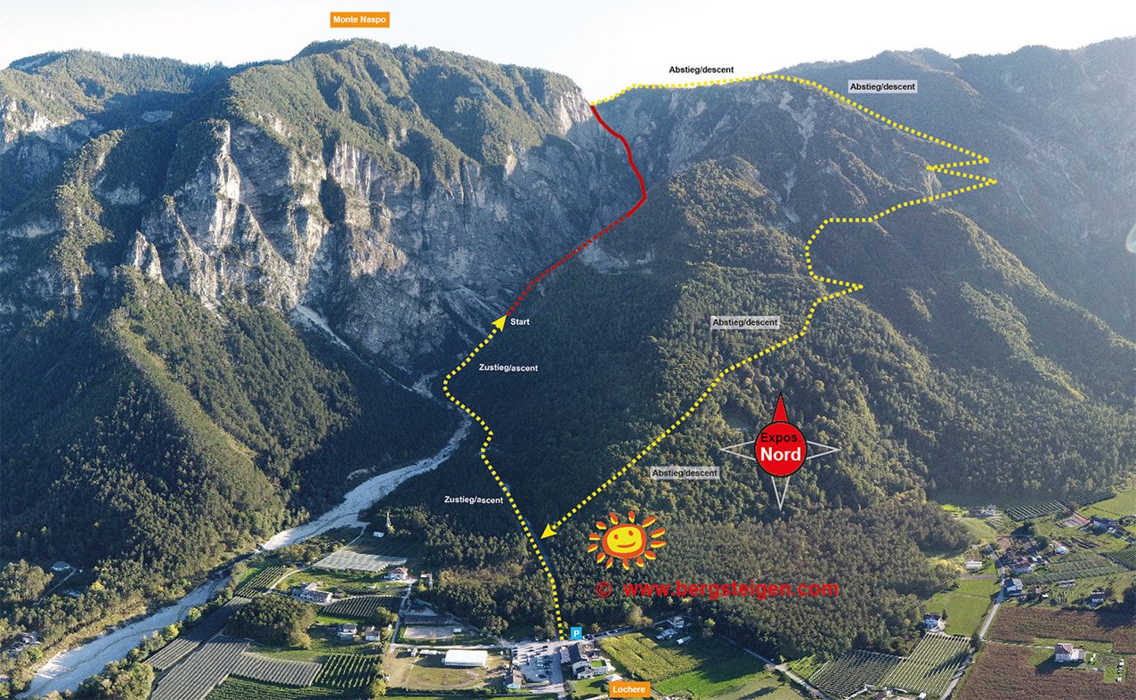 Vom Parkplatz beim Albergo Vedova auf der Asphaltstraße Richtung Norden gehen. Bei der ersten Kehre zweigt der Weg 233 gerade in das Val Scura ab. Man folgt dem Weg links bzw. rechts vom Bach bis zur ersten Seilsicherung bei einem großen Stein mit roter Markierung.