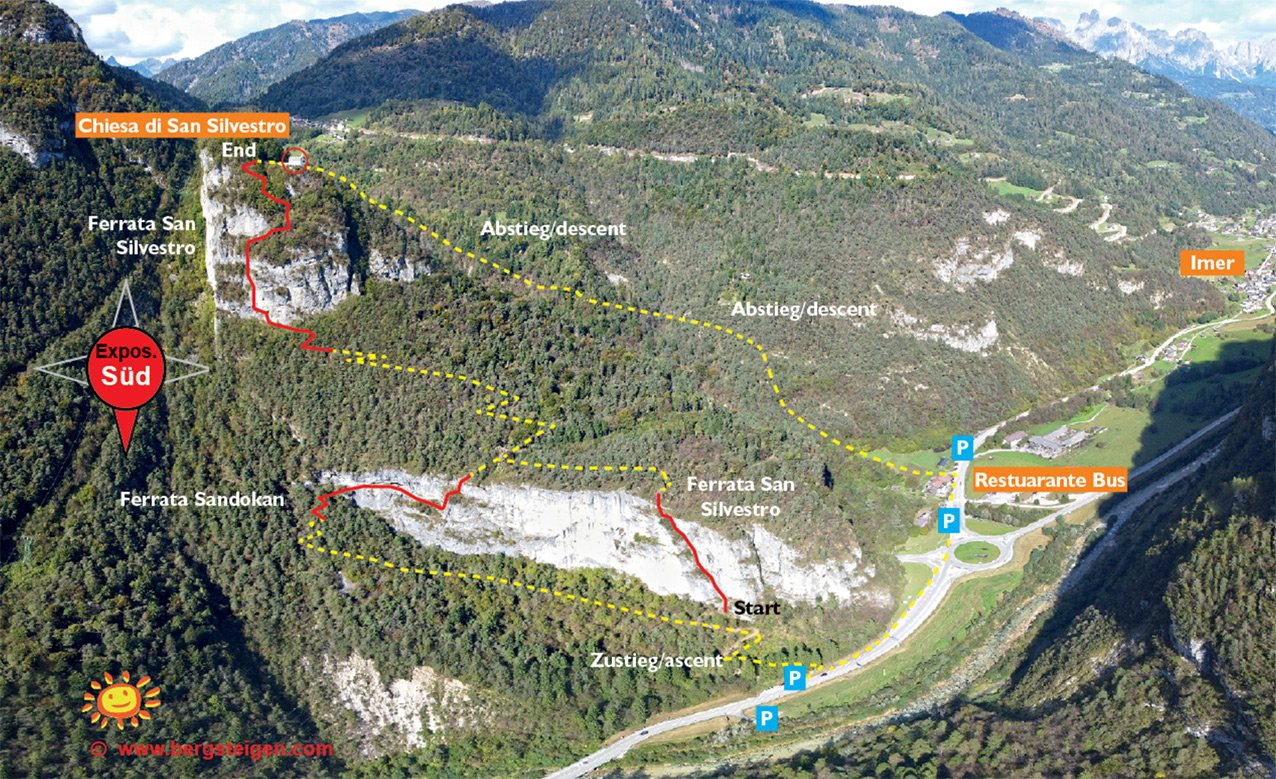 Die Ferrata Sandokan (siehe Topo) lohnt nicht als eigener Zustieg zum oberen Teil, wer die unteren Klammerrampen der Ferrata San Silvestro schafft, kommt auch gut den oberen Teil bis zur Kirche hinauf.