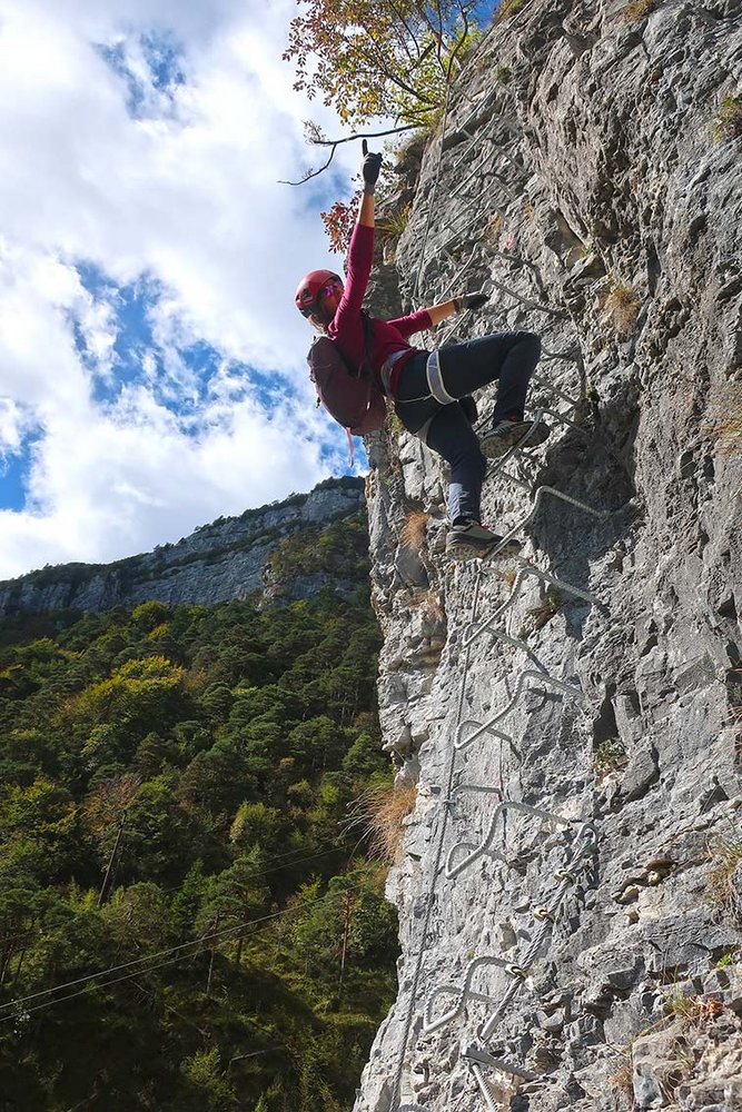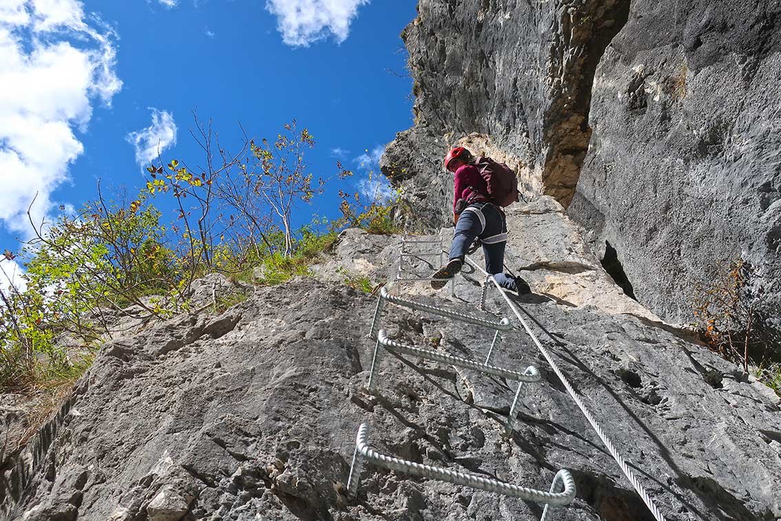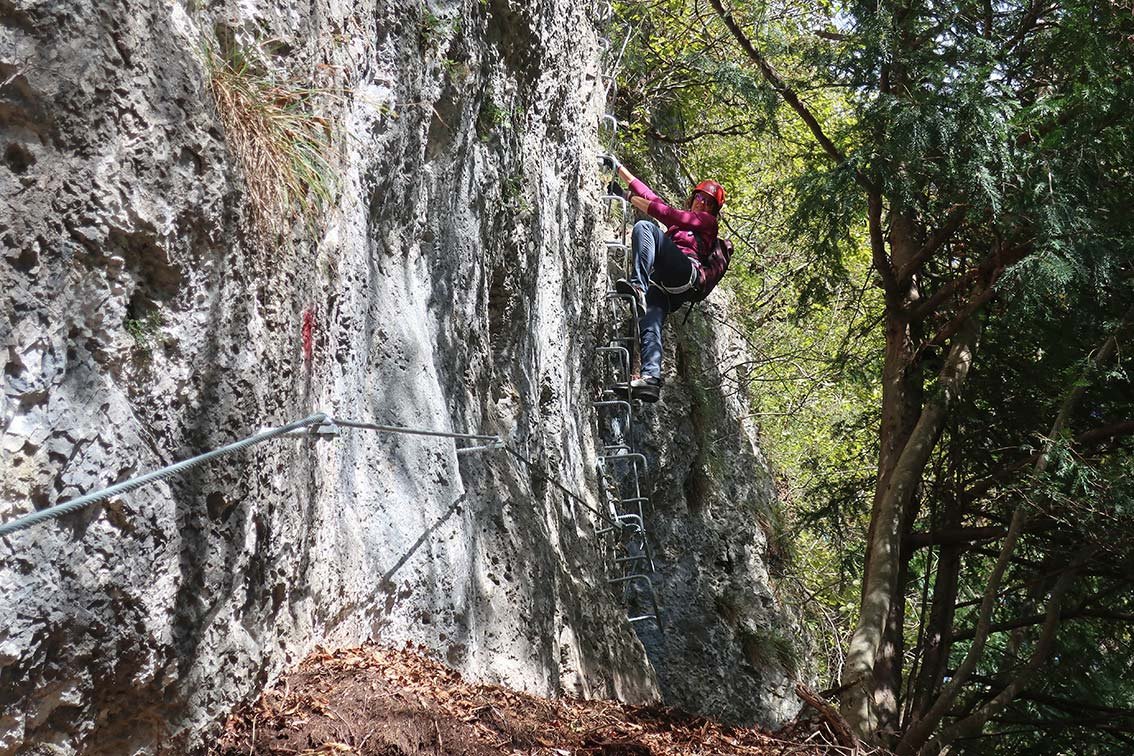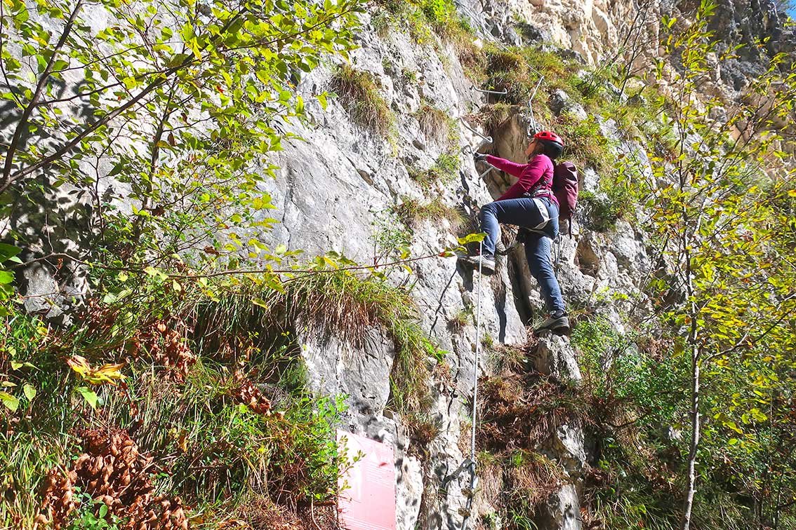 Der Klettersteig ist gut gesichert, teilweise passen aber Stahlseil und Klammern nicht gut zusammen (man steht immer etwas neben der Ideallinie).